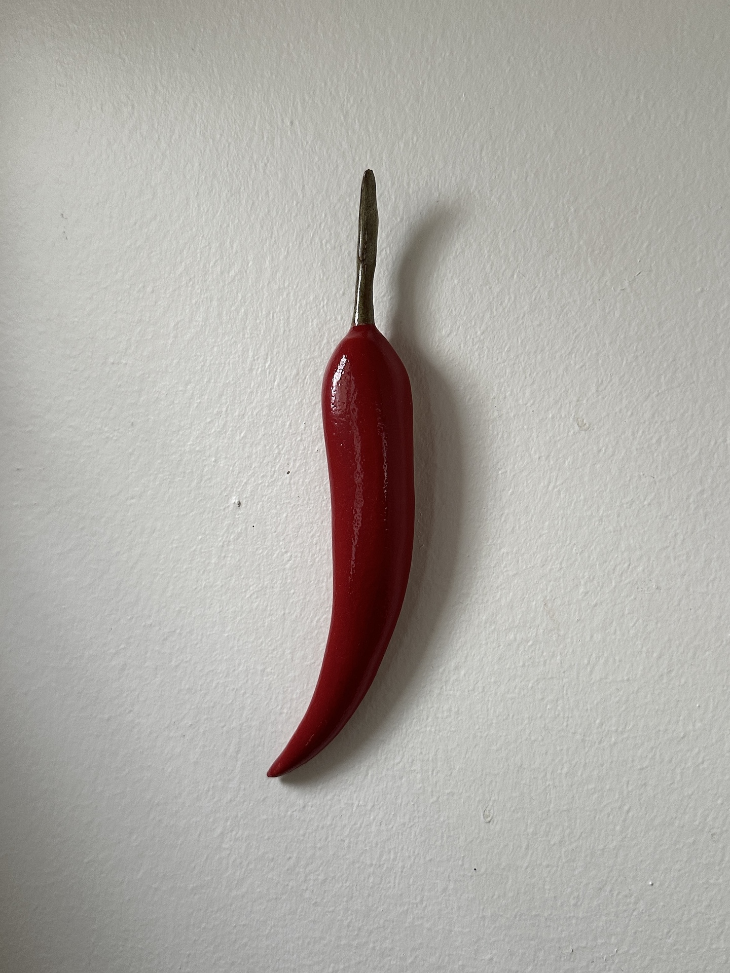 Veistos/seinäreliefi, n.17 x 5 cm. Kivitavara, lasite. Signeerattu. Työn taakse on koverrettu ripustuskolo, josta sen saa ripustettua seinälle. Chilin asentoa seinällä voi hieman säätää.