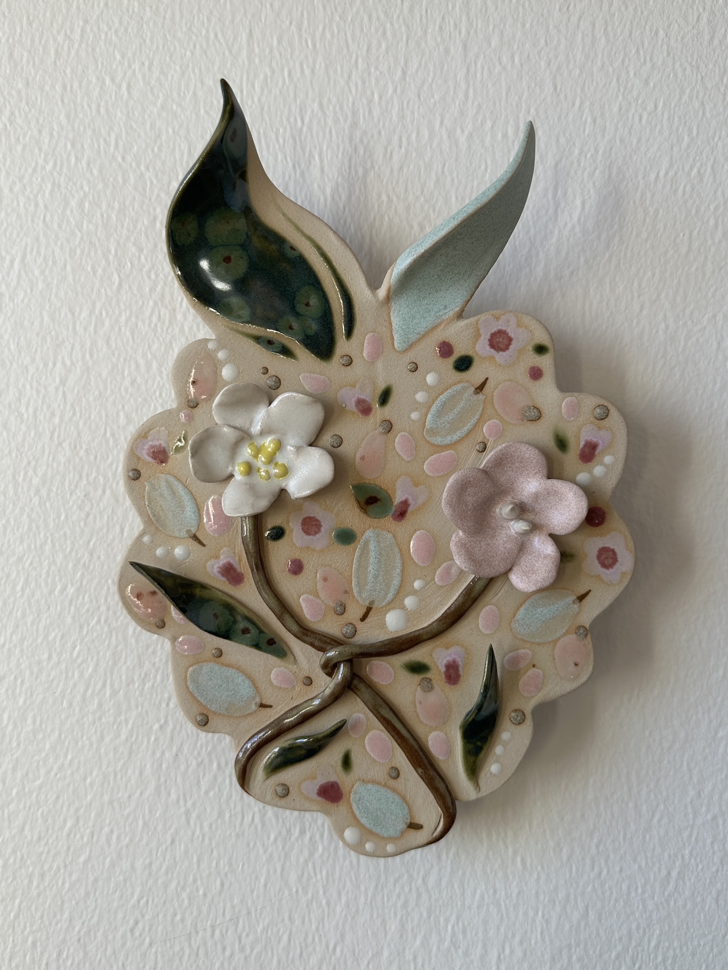 Seinäreliefi, 22 x 15 cm. Kivitavara, lasite. Signeerattu. Työn taakse on liimattu ripustuspala, josta sen saa ripustettua seinälle. Työn asentoa seinällä voi hieman säätää.