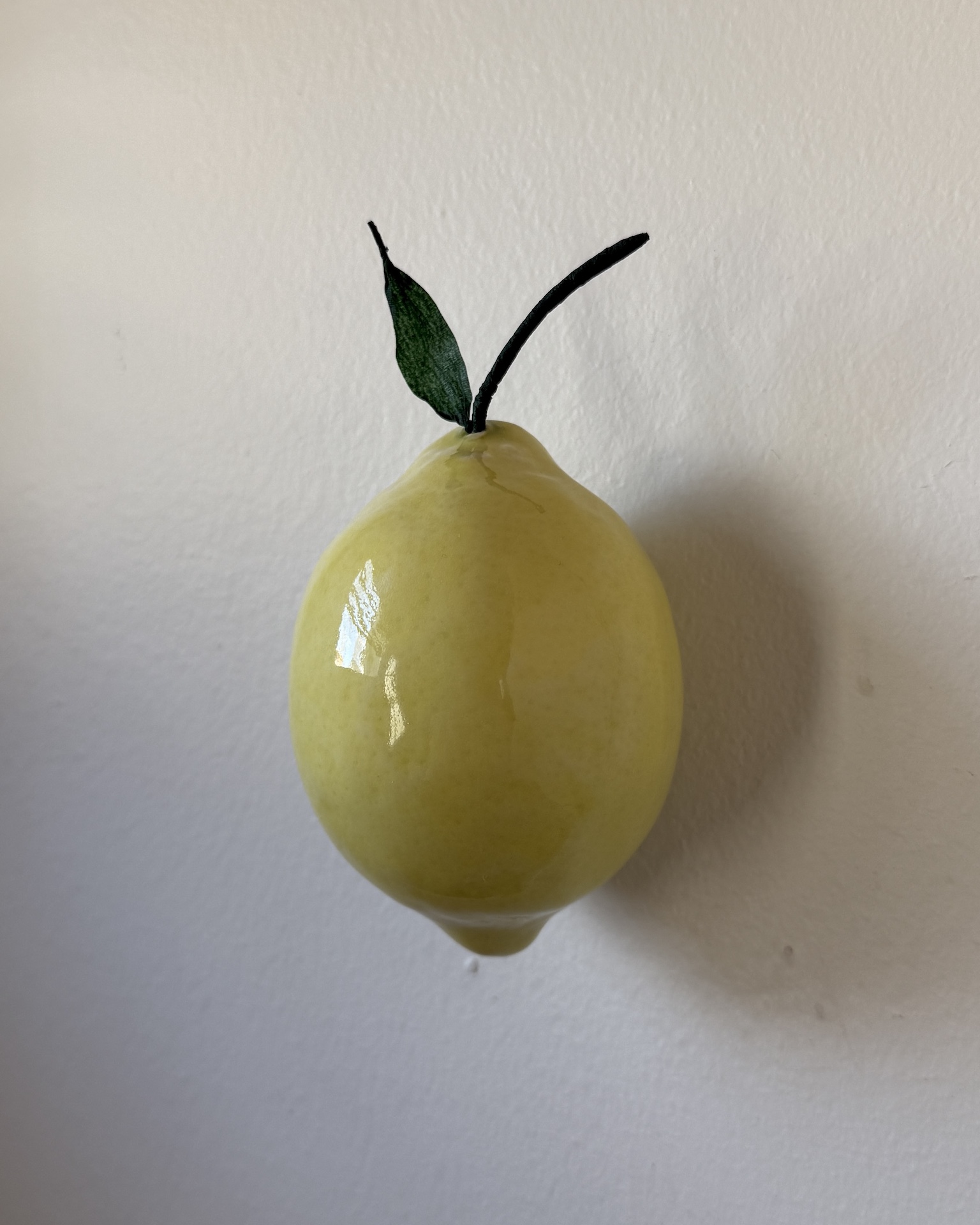 Seinäreliefi, n.13 x 7 cm. Kivitavara, lasite. Signeerattu. Työn takana on ripustuskolo, josta sen saa ripustettua seinälle. Sitruunan asentoa seinällä voi hieman säätää.