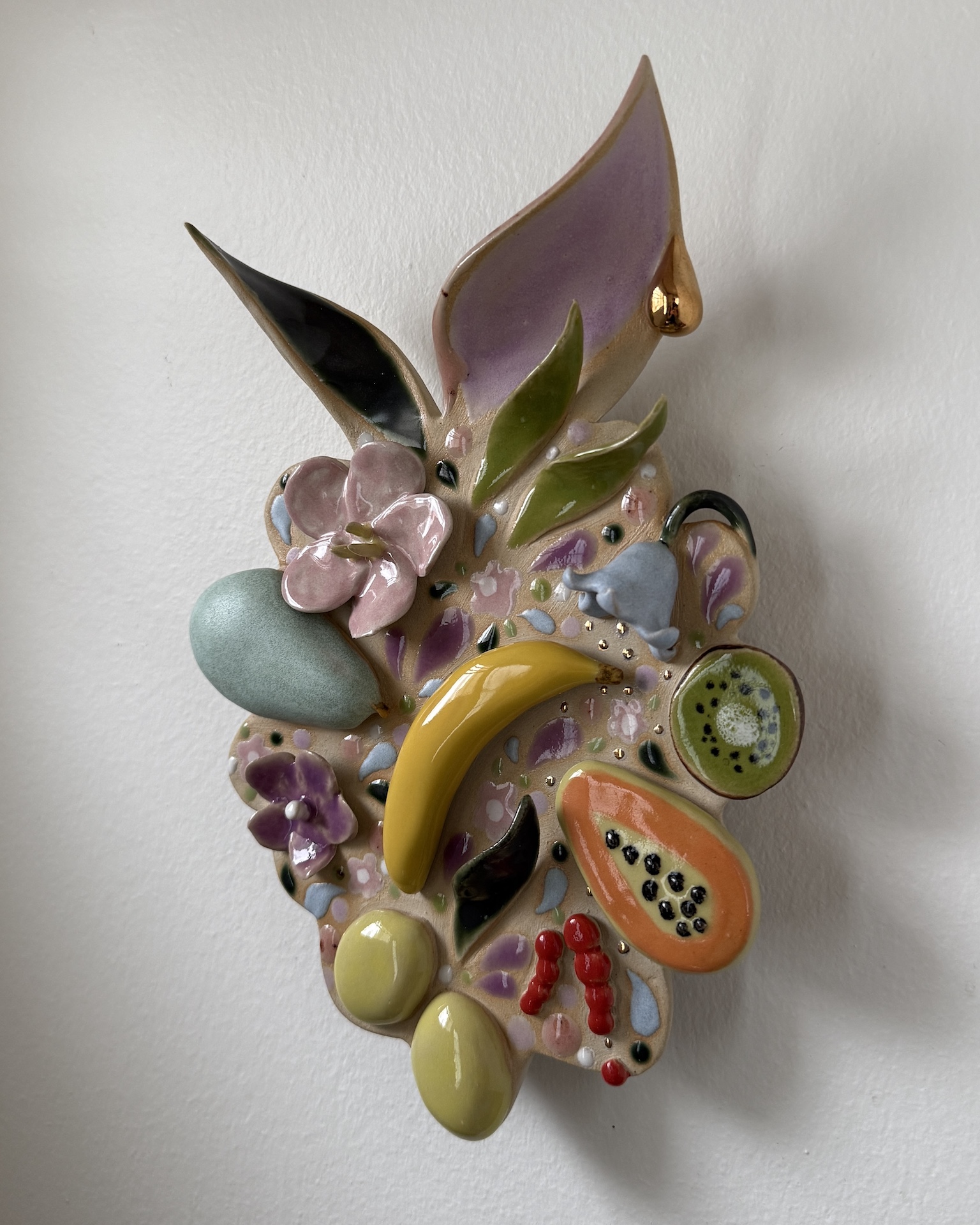 Seinäreliefi, n.22 x 15 cm. Kivitavara, lasite, kultalysteri. Signeerattu. Työn taakse on liimattu ripustuspala, josta sen saa ripustettua seinälle.