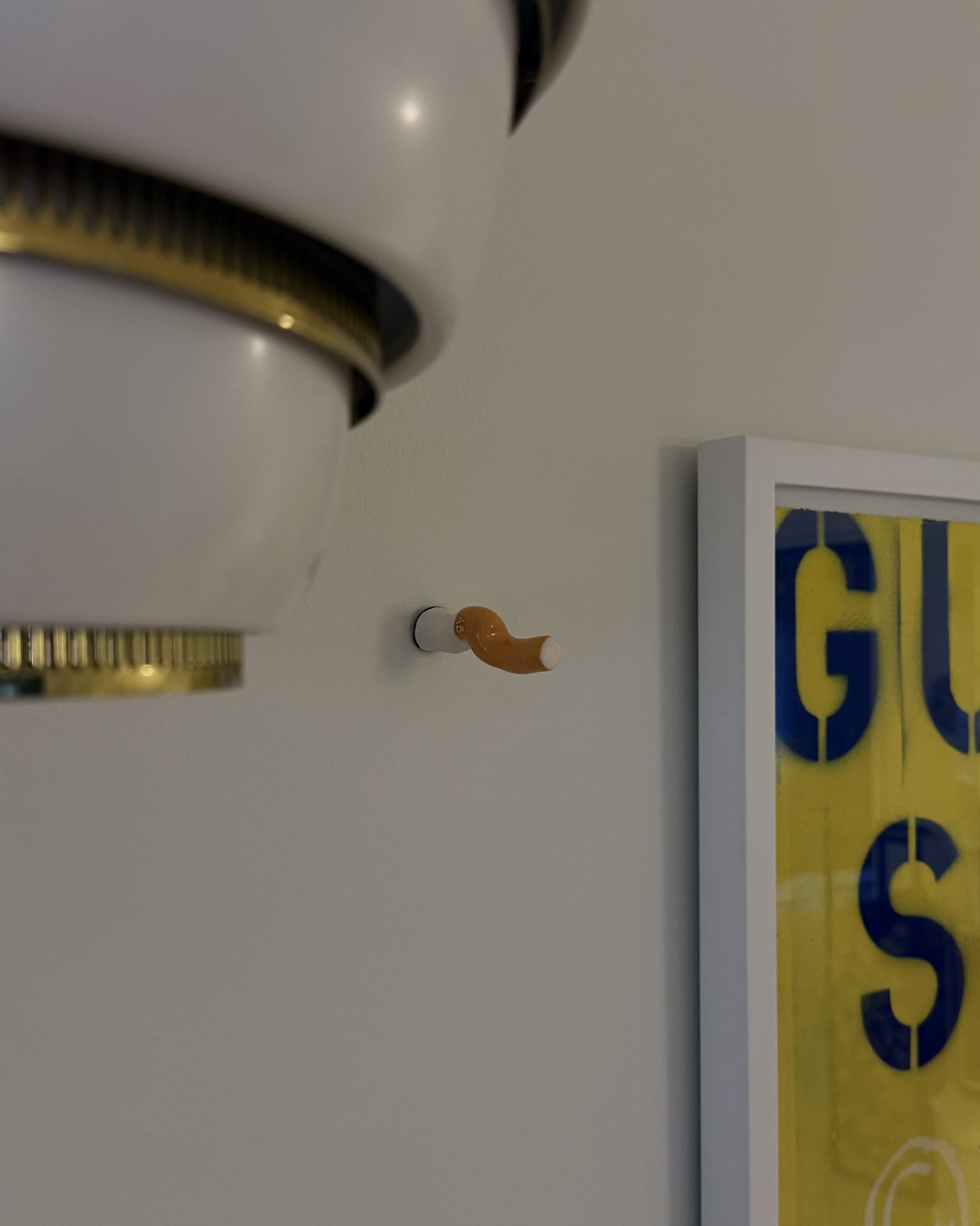 Seinäreliefi, n.7 x 3 cm. Kivitavara, lasite, lysteri. Signeerattu. Työn päähän on koverrettu ripustuskolo, josta sen saa ripustettua seinälle. Röökin asentoa seinällä voi hieman säätää.