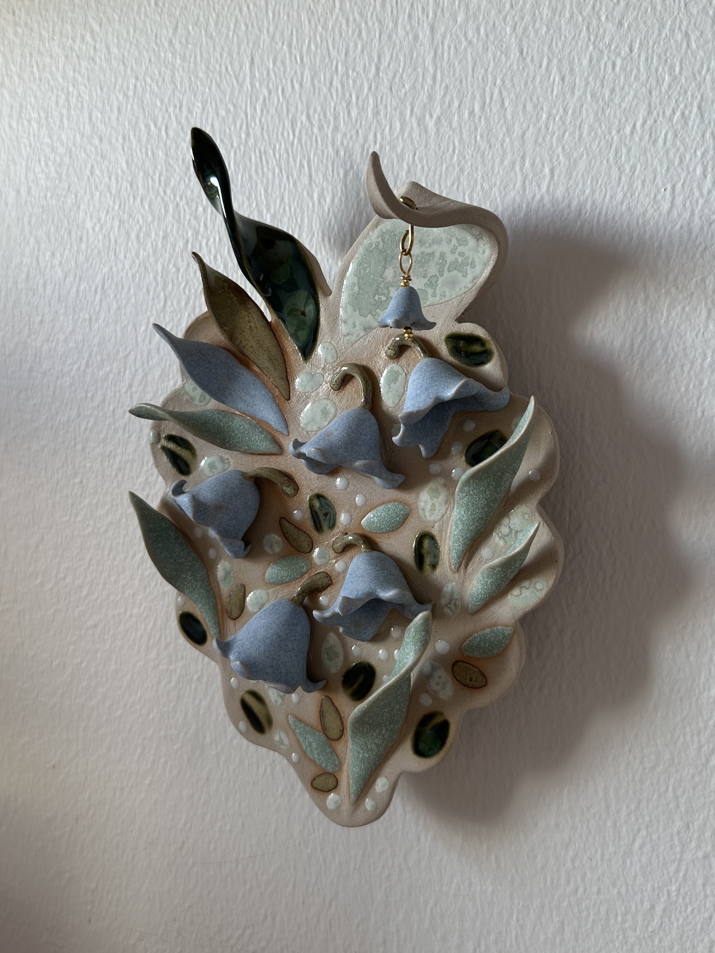 Seinäreliefi, 22 x 15 cm. Kivitavara, lasite. Signeerattu. Työn taakse on liimattu ripustuspala, josta sen saa ripustettua seinälle. Työn asentoa seinällä voi hieman säätää.