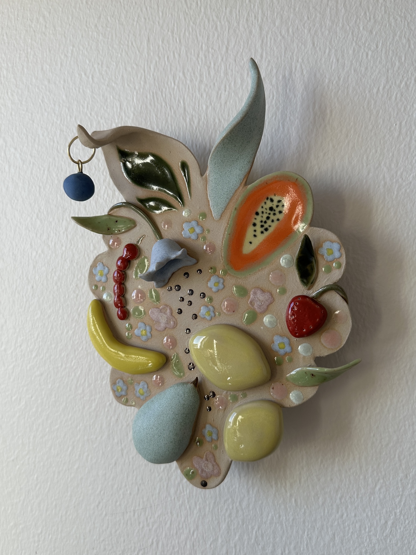 Seinäreliefi, 22 x 17 cm. Kivitavara, lasite. Signeerattu. Työn taakse on liimattu ripustuspala, josta sen saa ripustettua seinälle. Työn asentoa seinällä voi hieman säätää.