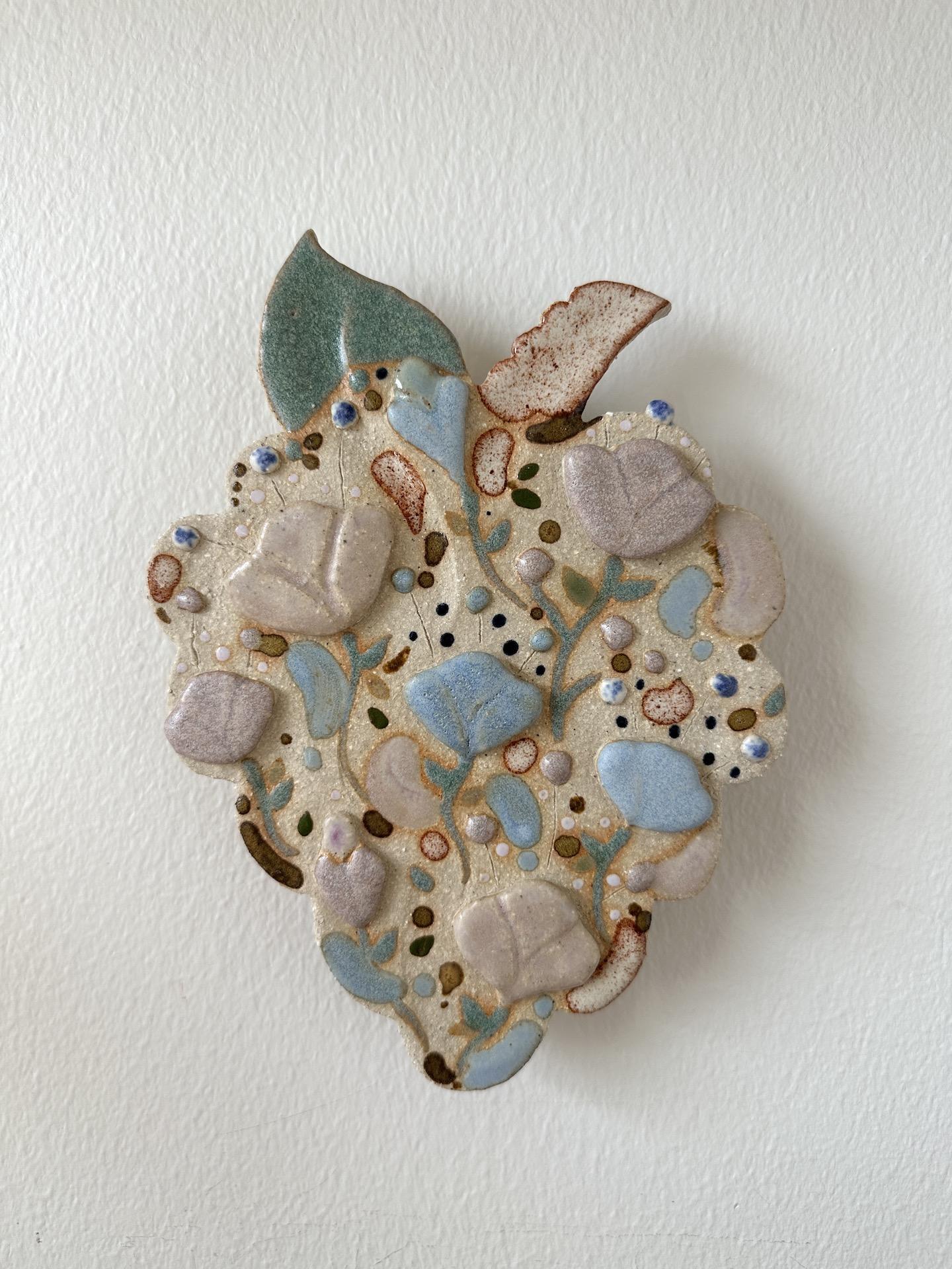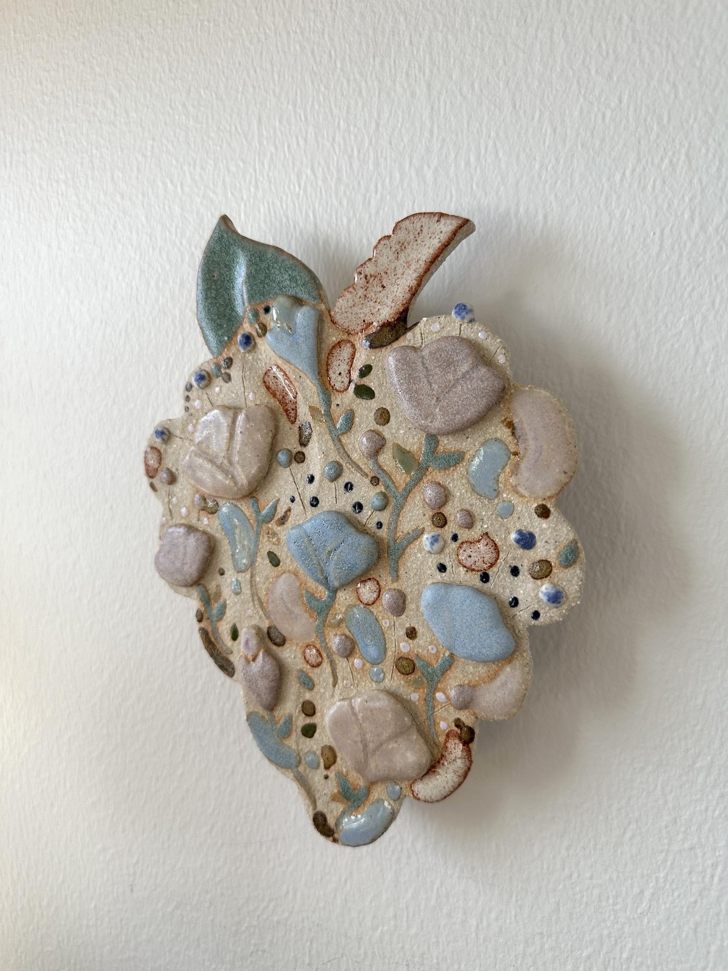 Seinäreliefi, n.22x16 cm. Kivitavara, lasite. Signeerattu. Työn taakse on liimattu ripustuspala, josta sen saa ripustettua seinälle.