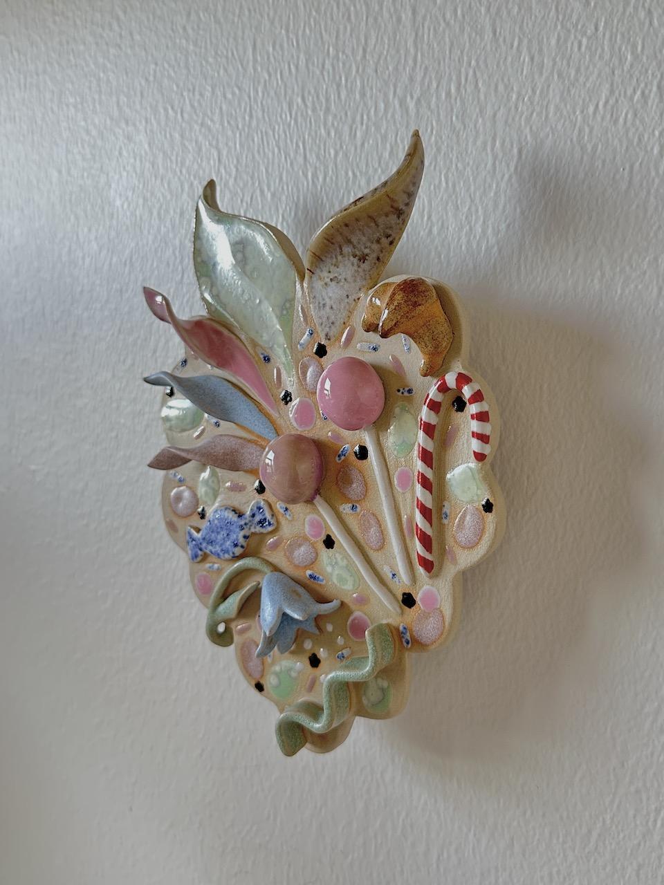 Seinäreliefi, 20 x 14 cm. Kivitavara, lasite. Signeerattu. Työn taakse on liimattu ripustuspala, josta sen saa ripustettua seinälle. Työn asentoa seinällä voi hieman säätää.