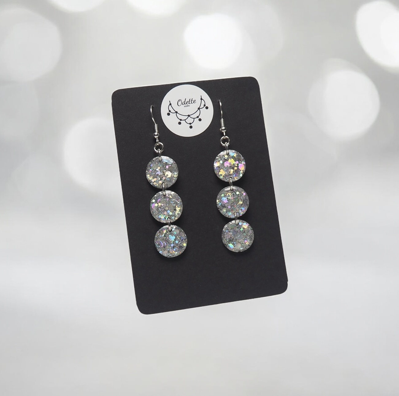 Hartsista ja glitteristä valmistetut säihkyvät korvakorut▪️pituus 7cm,yhden palan halkaisija 1,5cm▪️Hopeoitu,nikkelitön