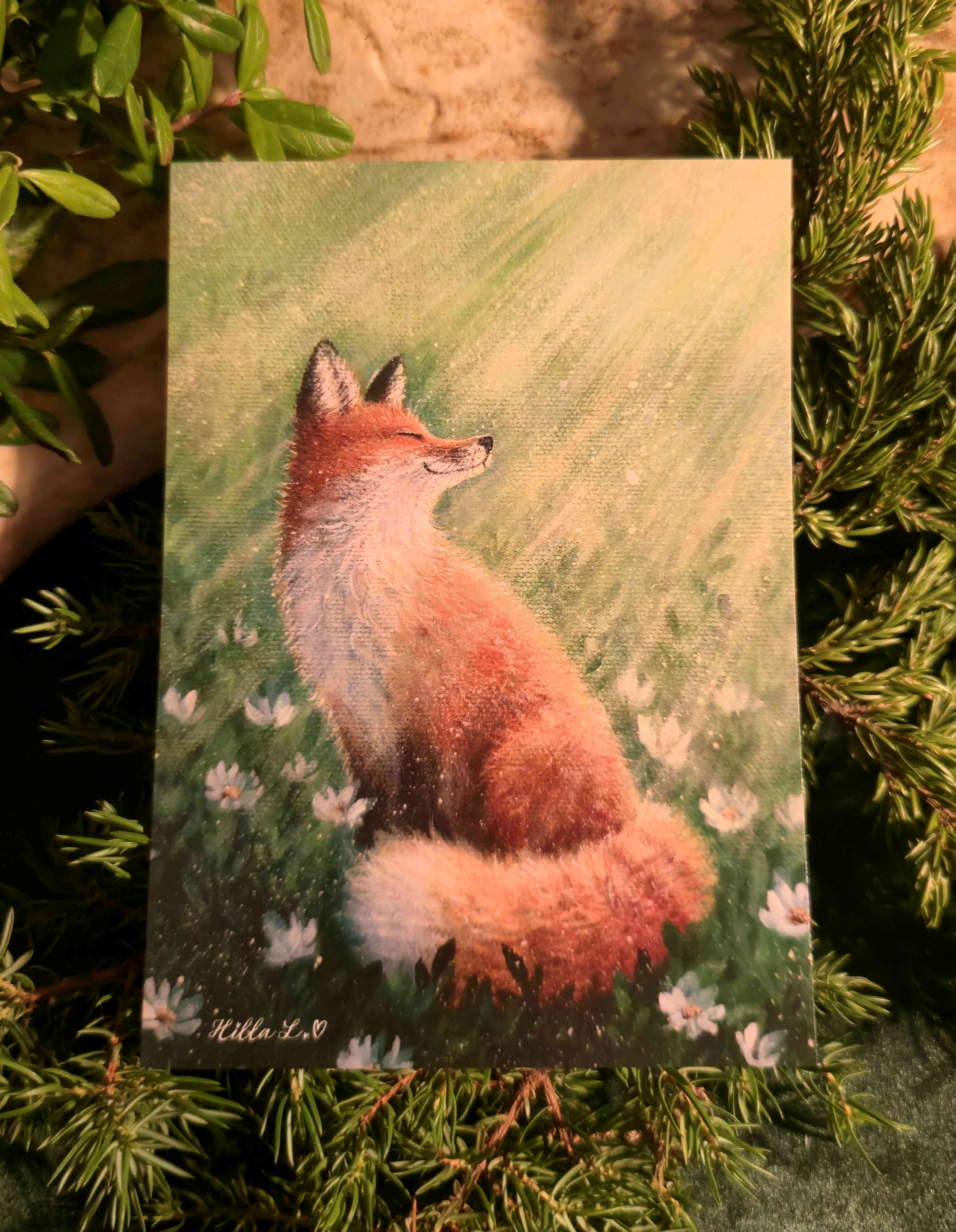 Onnenkettu Art:n jouluiset taidekortit ovat saaneet kuvituksensa Hilla Löytynojan hyvän mielen maalauksista. Taianomaiset ja tunnelmalliset kortit tuovat hyvän mielen! Kortin takaa löytyy osoiterivit. Kortin koko on a6. Kortit on Suomessa painettu.
