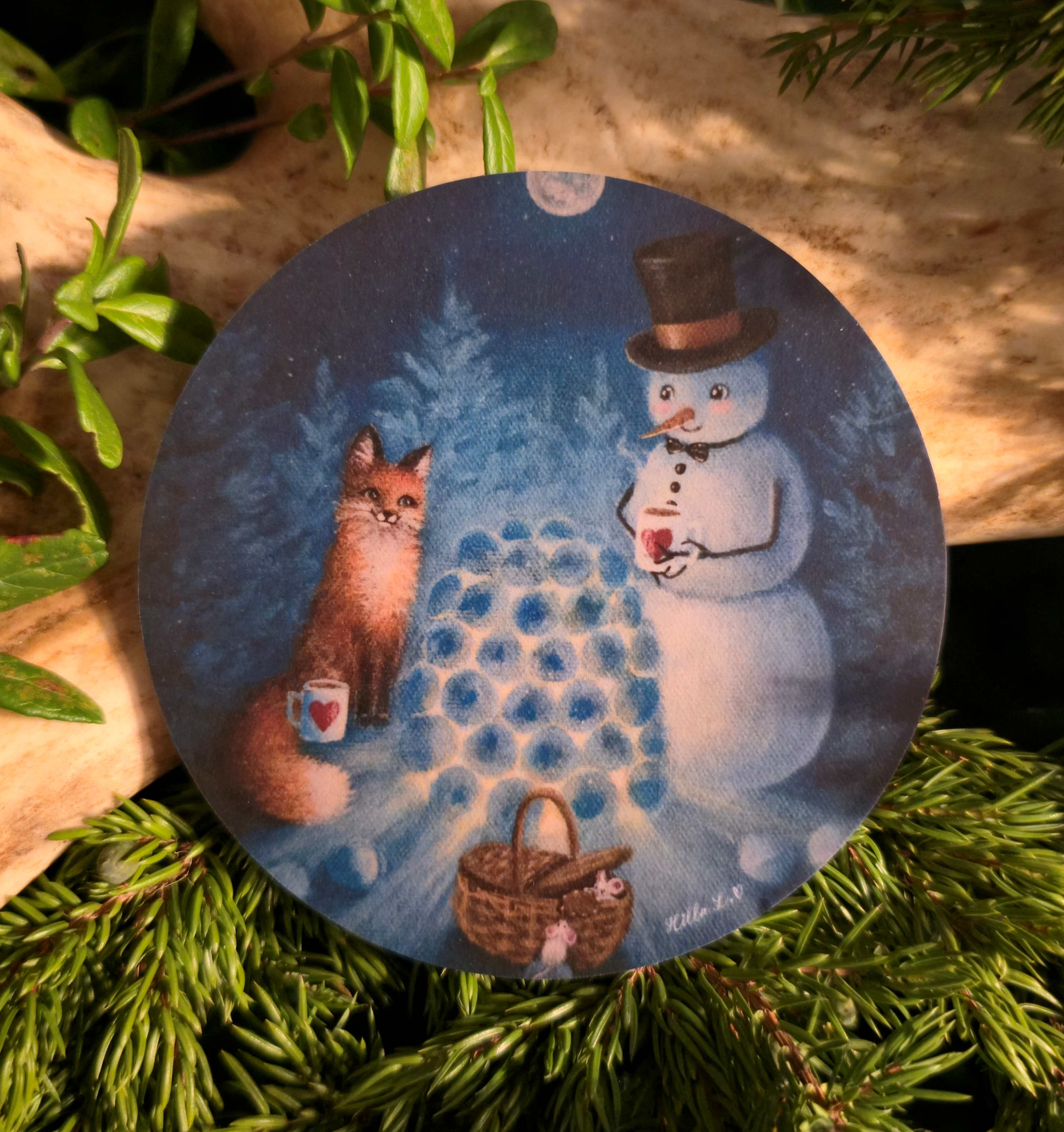 Tämä lasinalunen on suomalaisesta koivuvanerista käsityönä valmistettu täysin kotimainen tuote. Tuotteen kuvitus on taiteilija Hilla Löytynojan maalauksesta peräisin. Pyöreän lasinalusen halkaisija on 10cm. Puhdistukseen suositellaan nihkeällä pyyhintää, koska vaneri vääntyy liiasta kosteudesta.