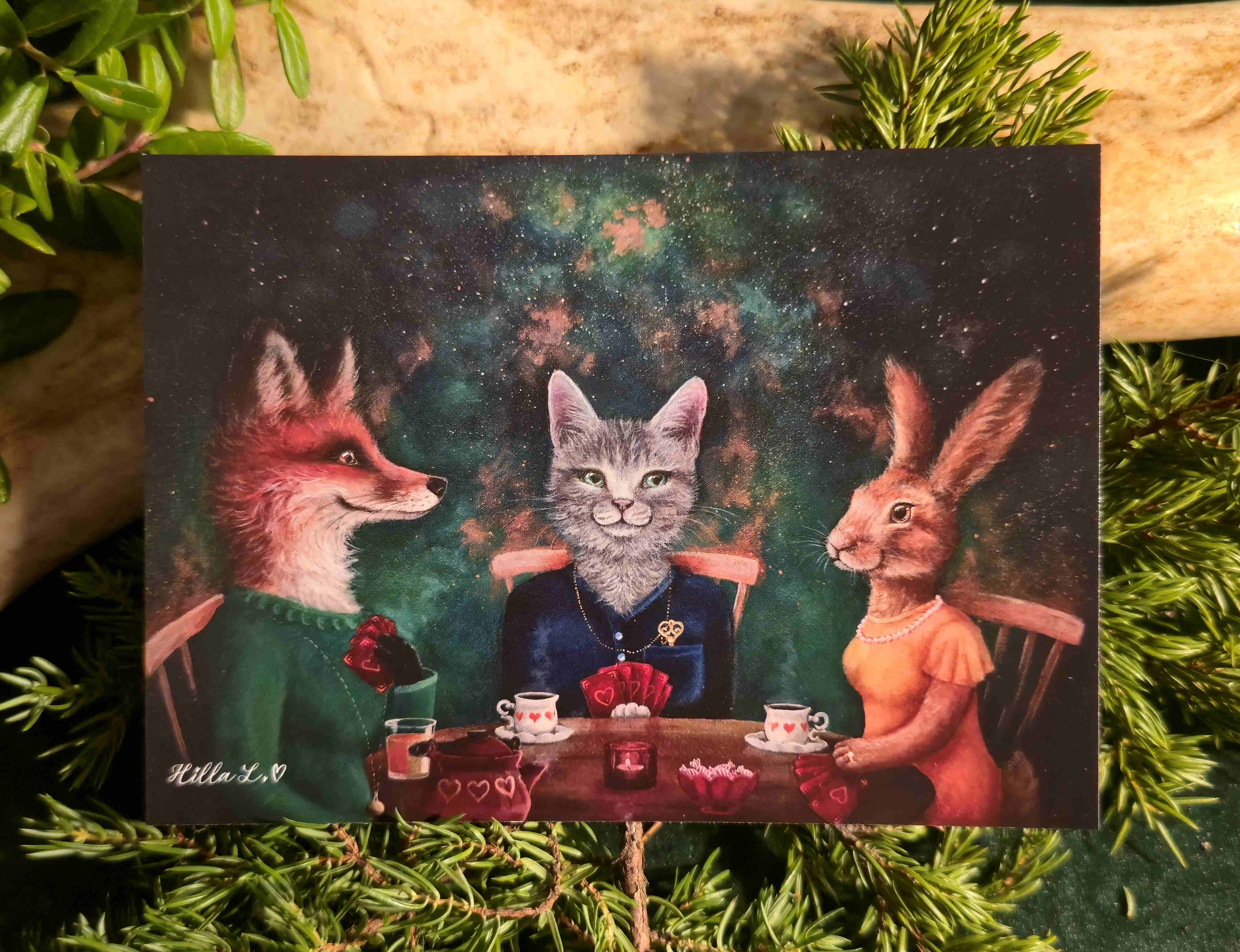 Onnenkettu Art:n taidekortit ovat saaneet kuvituksensa Hilla Löytynojan hyvän mielen maalauksista. Taianomaiset ja tunnelmalliset kuvitukset tuovat hyvän mielen! Kortin takaa löytyy osoiterivit, joten se sopii myös postitettaviksi. Kortit on painettu Suomessa.