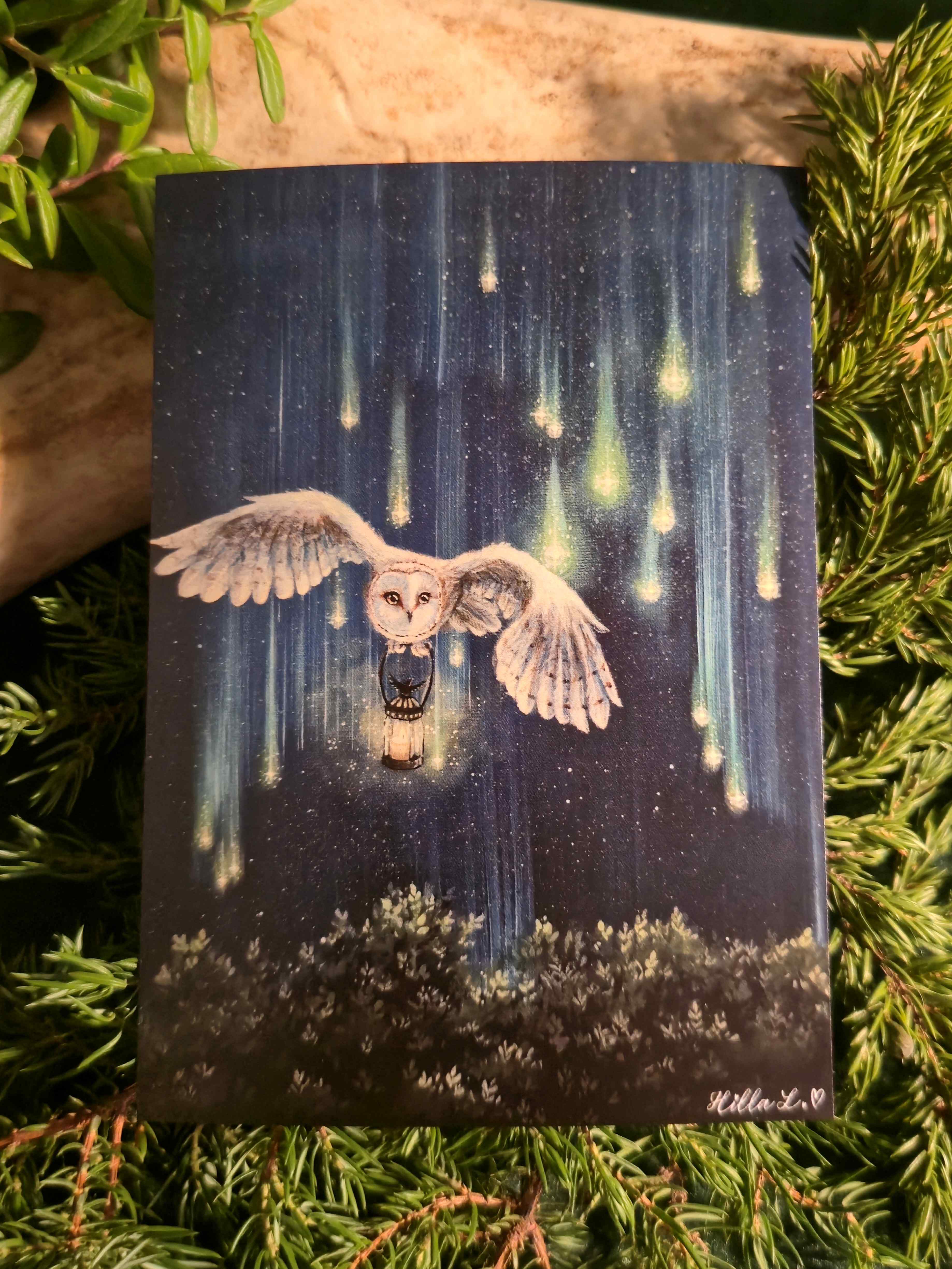 Onnenkettu Art:n taidekortit ovat saaneet kuvituksensa Hilla Löytynojan hyvän mielen maalauksista. Taianomaiset ja tunnelmalliset kortit tuovat hyvän mielen! Kortin takaa löytyy osoiterivit. Kortit on Suomessa painettu.
