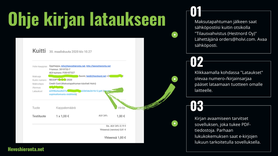 Toimitus heti maksutapahtuman jälkeen. Saat ilmoittamaasi sähköpostiin kuitin, jonka kohdasta "Lataukset" klikkaamalla kirjain-/numerosarja linkkiä pääset lataamaan tuotteen omalle laitteelle. Latauslinkki sisältää kolme latausta. Linkin eteenpäin jakaminen ei ole sallittua. Väärinkäytökset saattavat evätä latausoikeuden. Tuotteen kuvia selaamalla löydät lataamiseen liittyviä lisäohjeita.