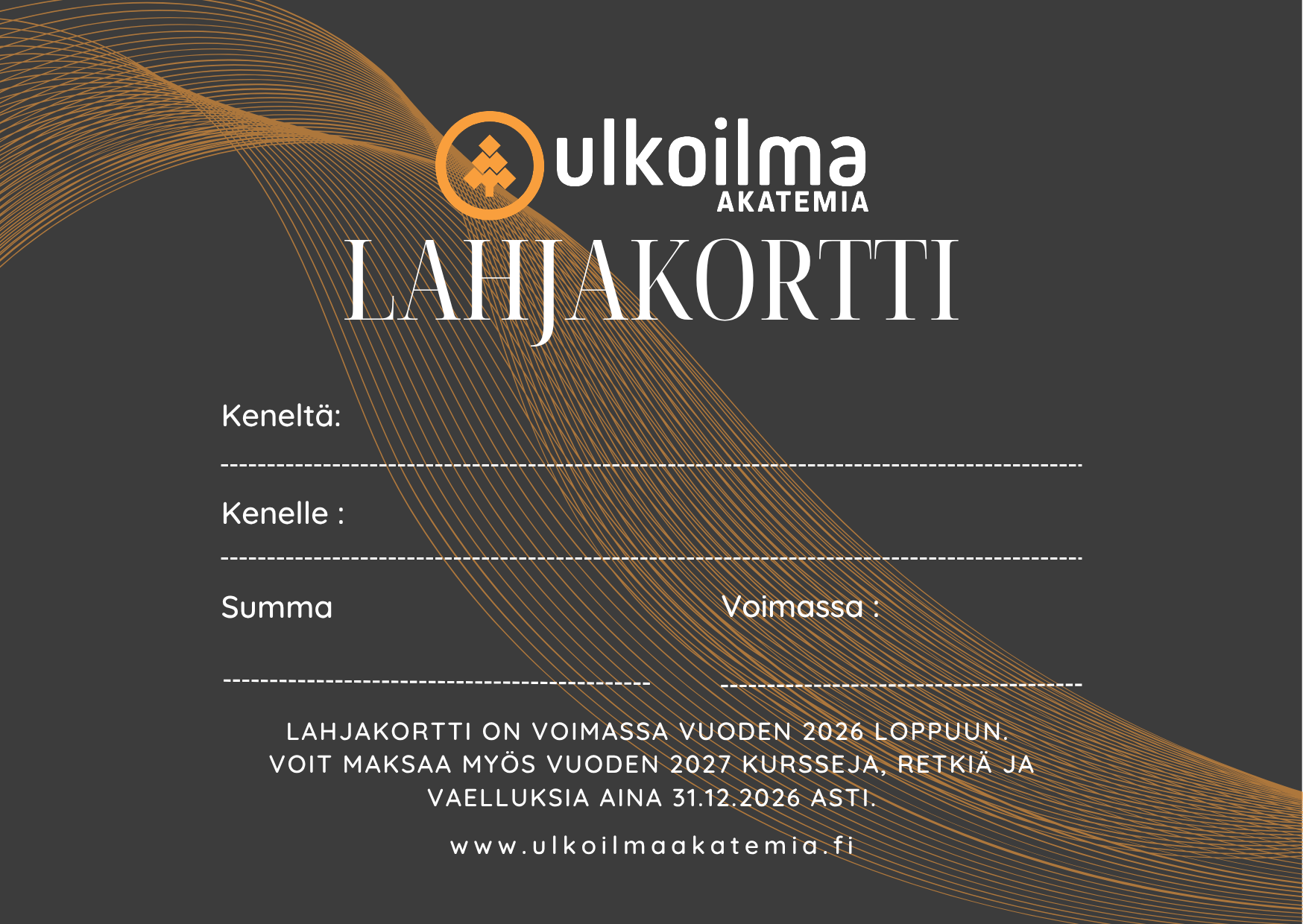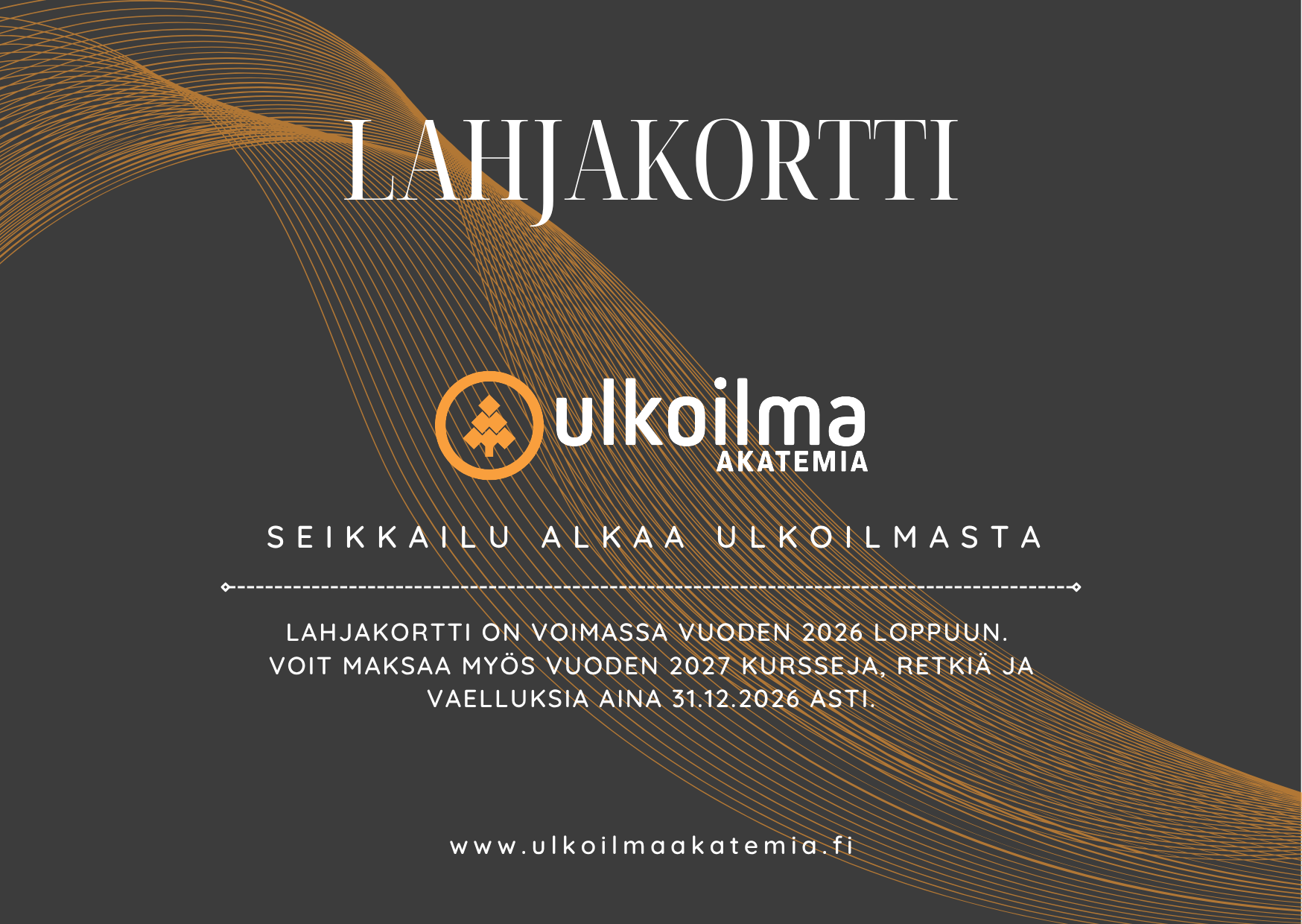 Säilytä lahjakortin kuitti ja receipt numerosarja. Lahjakortti käy maksuvälineenä Outdoor Adventures Finland kursseilla ja vaelluksilla. Lahjakortin arvon voi yhdistää myös KalajaRetkeilyn ja Ulkoilma Akatemian toimintaan, retkiin ja vuokrauksiin. Tämä lahjakortti on voimassa vuoden ostopäivästä alkaen.