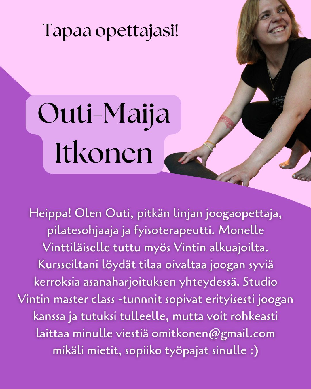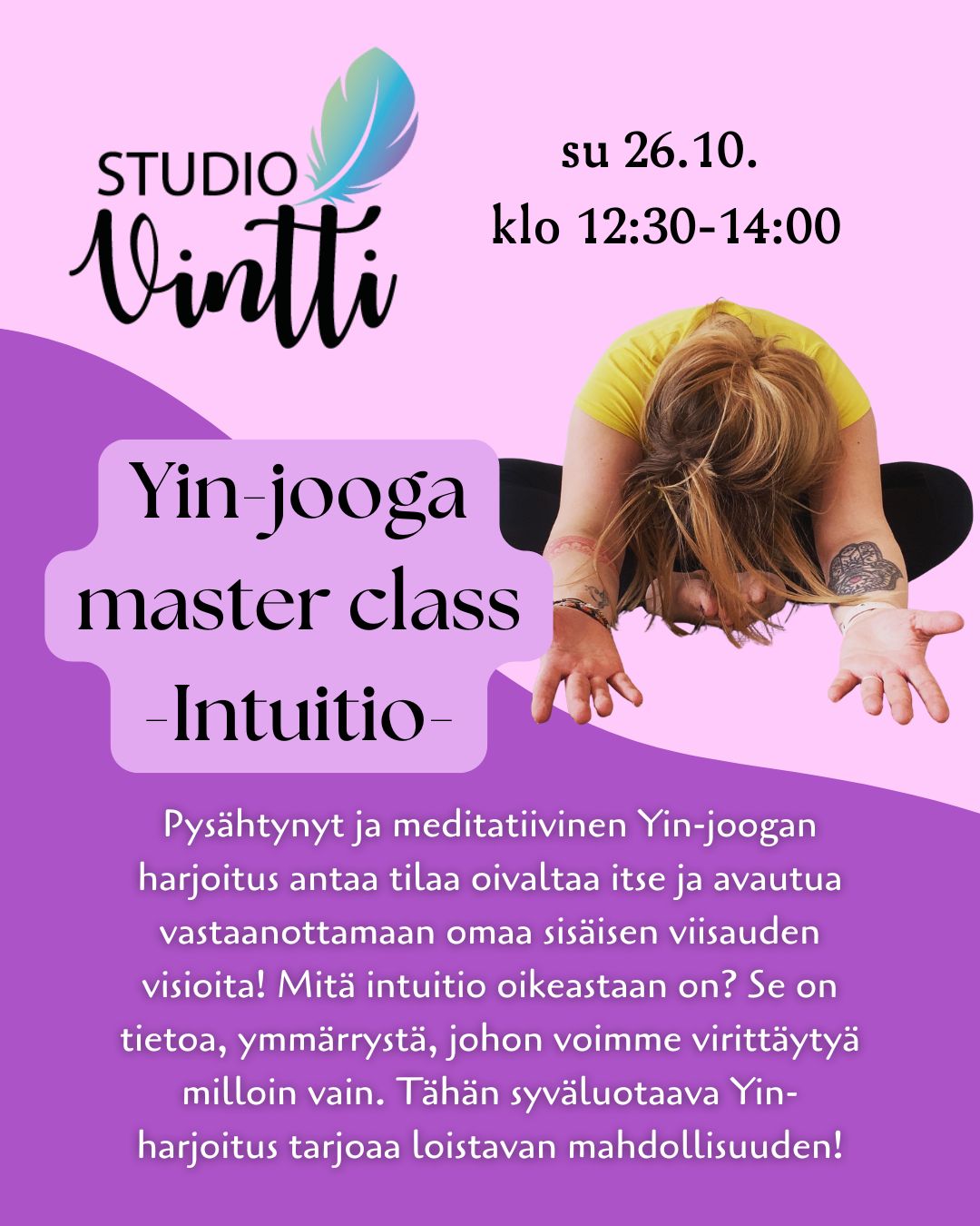 HUOM! Ennakkovaraajan lippu myynnissä 5.10. saakka - tämän jälkeen hinta 39€! Tervetuloa mukaan Yin-jooga - Master Classiin Tampereen Studio Vintille sunnuntaina 26.10. klo 12:30-14:00! Yin-joogan pysähtynyt, meditatiivinen harjoitus sallii tilaa sukeltaa syvälle omaan sisäiseen maailmaan ja avautua omalle sisäiselle viisaudelle. Tämän harjoituksen sisällä pohdimme intuitiota - mitä se oikeastaan on? Se on tietoa, joka piileksii päivätietoisuutemme tutkan alapuolella - voit kuitenkin virittäytyä intuition taajuudelle ja oivaltaa elämää syvemmällä, tyydyttävämmällä tasolla. Tämä harjoitus sopii sinulle etenkin, jos sinulla on jo jonkin verran kokemusta Yin-joogan pysähtyneestä luonteesta tai jos olet erityisen kiinnostunut jalostamaan taitoasi virittäytyä intuitiosi taajuudelle. Voit asennoitua tähän harjoitukseen kysymyksellä: mitä tämä harjoitus voi opettaa minulle, minusta. Lämpimästi tervetuloa mukaan! <3 Mikäli mietit, sopiiko työpaja sinulle, laita minulle sähköpostia: omitkonen@gmail.com.