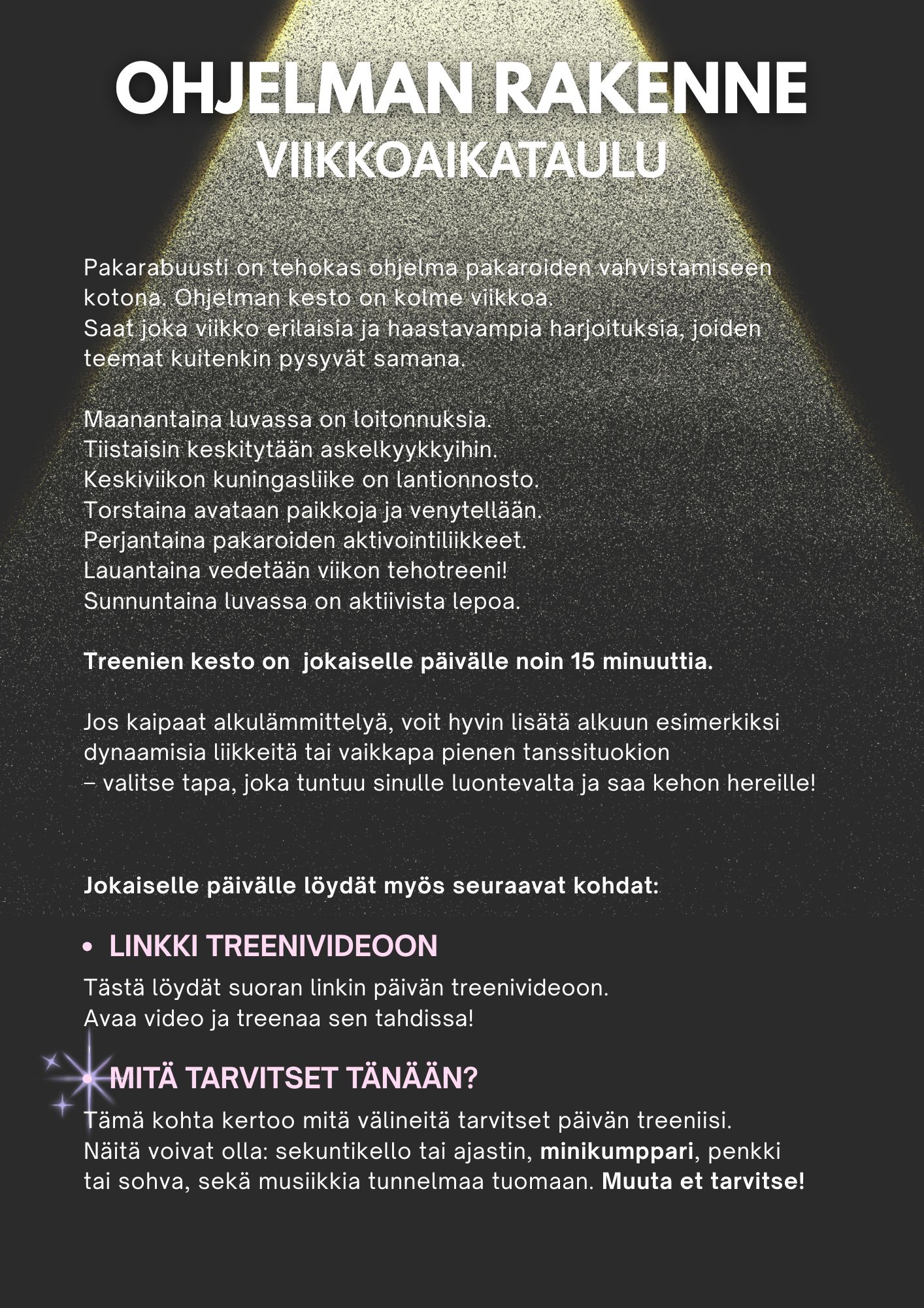 Pakarabuusti kotona – Tehokas kotitreeniohjelma pyöreämpiin pakaroihin, vain 15 min päivässä! Unelmoitko vahvemmista ja pyöreämmistä pakaroista ilman salia, säätöä tai aikapainetta? Tämä energinen ja selkeä ohjelma sisältää valmiiksi kuvatut videotreeniä, joita voit tehdä helposti kotona yhden minibandin avulla. Saat viikoittain 4 erilaista pakaratreeniä, 1 toistuvan tehotreenin ja 2 palauttavaa liikkuvuuspäivää – kaikki rakkaudella rakennettu Pakaravalkun asiantuntemuksella. Vain yksi vastuskuminauha, vain vartti päivässä, eikä sinun tarvitse miettiä mitään – paina vain Play ja treenaa mukana. Sopii kiireisille tai aloitteleville, jotka haluavat näkyviä tuloksia mahdollisimman helposti ja tiiviissä ajassa. Saat tästä loistavan buustin pakaroidesi kehitykseen!