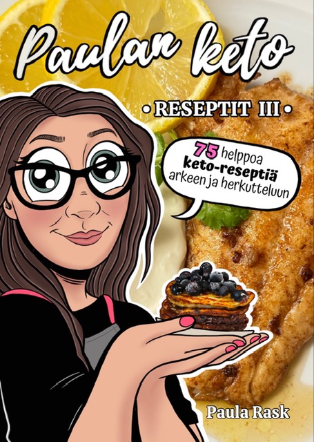 Paulan keto reseptit 3 kirja sisältää 75 uutta reseptiä. Tämä on jatkoa kirjoille 1 ja 2 eli tässä eri reseptit kuin niissä. Kyseessä siis ihan oikea kirja, ei nettiversio. Kirjan kaikki reseptit ovat viljattomia eli täysin gluteenittomia myös sekä sokerittomia. Kirjan alussa on esittelyteksti Paulasta ja ketogeenisesta ruokavaliosta selkeästi ja ymmärrettävästi. On kerrottu ketoleivontaan sopivista tuotteista ja niiden käytöstä. Kuvalliset tuotekuvat auttaa kauppareissulla, jos tyotteet ei ennestään tuttuja. Kirjan sivuilla reseptien välissä vilahtelee myös erilaisia ketoelämän vinkkejä <3 Herkkujen lisäksi kirja sisältää perus arkiruokia, leipiä, naposteltavia, suolaista ja makeaa leivottavaa. Totuttuun Paulan tyyliin reseptit on helppoja ja ei vaadi kauan keittiössä kykkimistä tai monia kymmeniä aineksia. Ruuat on koko perheelle maistuvia, ei tehdä erikoisuuksia. Osa resepteistä on erittäin vähähiilihydraattisia ja osa rennompaa settiä. Osaan resepteistä on laskettu makrot mukaan.