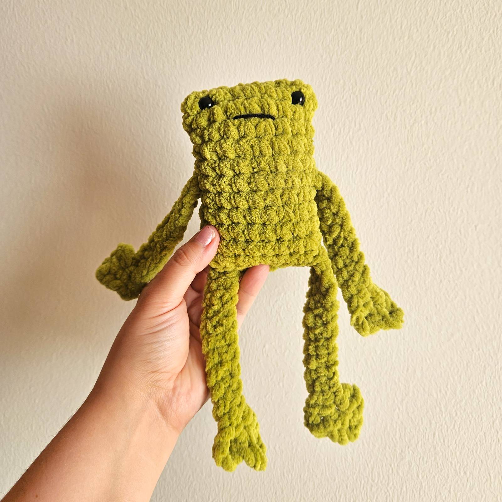 Tiktokistakin tuttu sammakko jalkanen :3 Vartalon koko n. 13cm. Huom! Väri voi näyttää eriltä jokaisella näytöllä, mutta sammakko on vaalean vihreä. Jokainen sammakko on uniikki, koska tuote on käsin tehty. :) Ei suositella alle 3-vuotiaille, silmät pieniä osia. Ota yhteyttä, jos haluat vauvaturvallisen version tai toisen värin -> elina(a)pehemiapaketti.fi