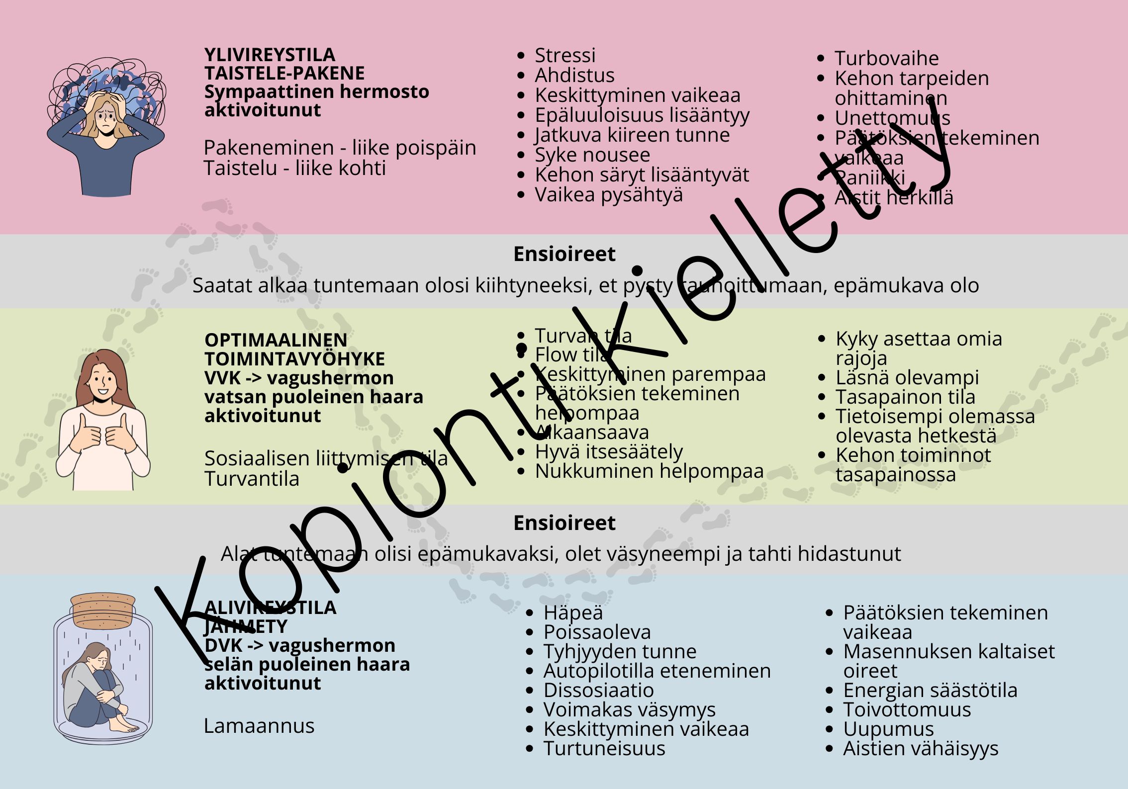 Vireystilakartta on ihmissuhdetyötä tekeville suunniteltu työkalu, joka auttaa asiakasta tunnistamaan ja ymmärtämään vireystiloja ja säätelemään niitä. Kartassa tulee esiin optimaalinen vireys, alivireys ja ylivireys ja niille tunnusomaisia piirteitä. Kartta sopii myös omaan käyttöön kotiin tai ihmissuhdeammattilaisen omien vireystilojen tarkasteluun. Kartta toimii hyvin yhdessä Vireystilaa säätelevien vakauttavien korttien kanssa. Kartta on värillinen, A4 kokoinen ja tulostettavassa muodossa. Kartan on visualisoinut Katja Saarinen.