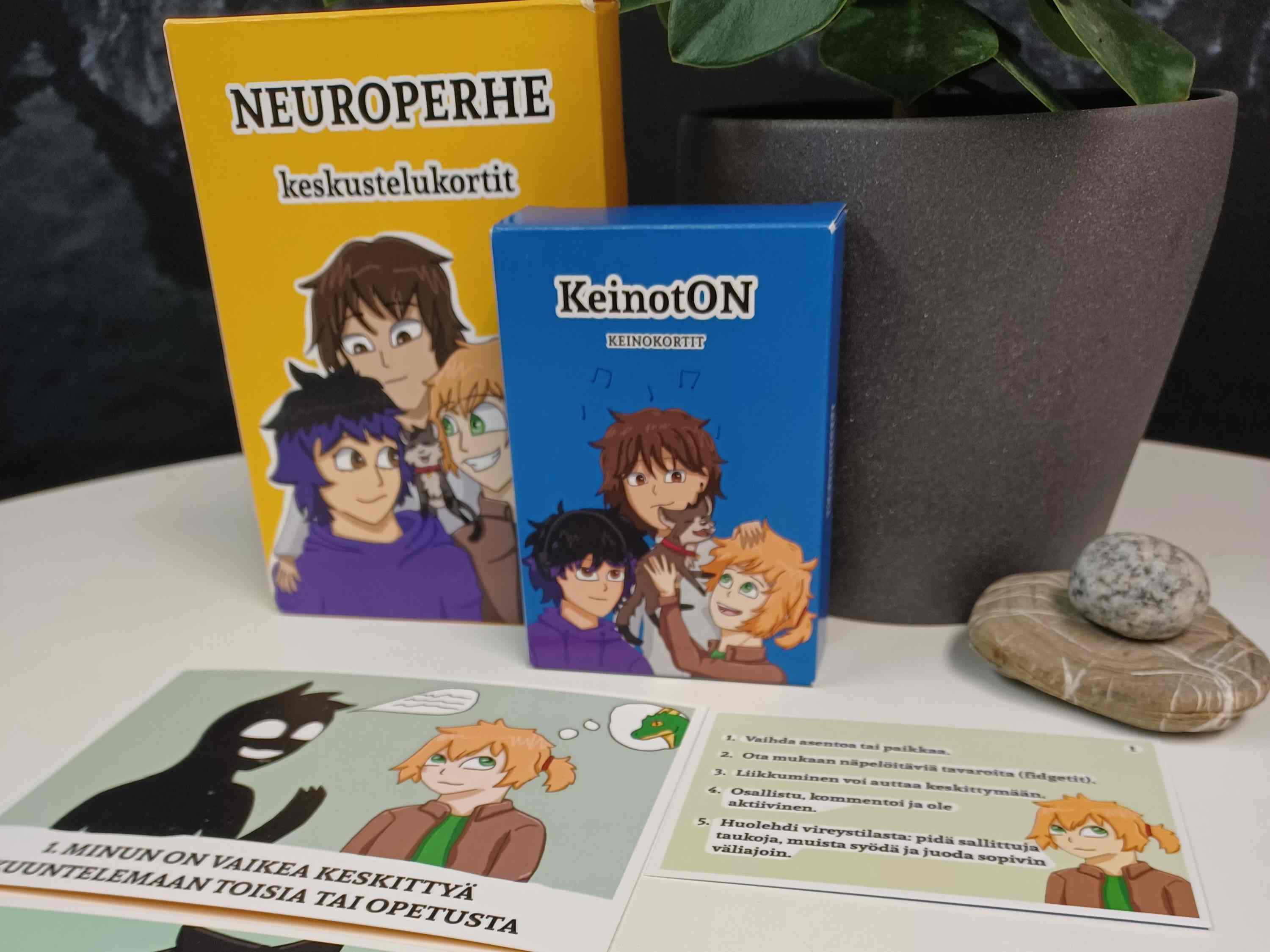 Neuroperhe keskustelukortit ja KeinotON Keinokortit yhdessä paketissa! (norm. Neuroperhe keskustelukortit 45,50€, KeinotON Keinokortit 43,50€). Hinta voimassa verkkokaupassa ja sähköpostitse ostettuun tuotepakettiin.