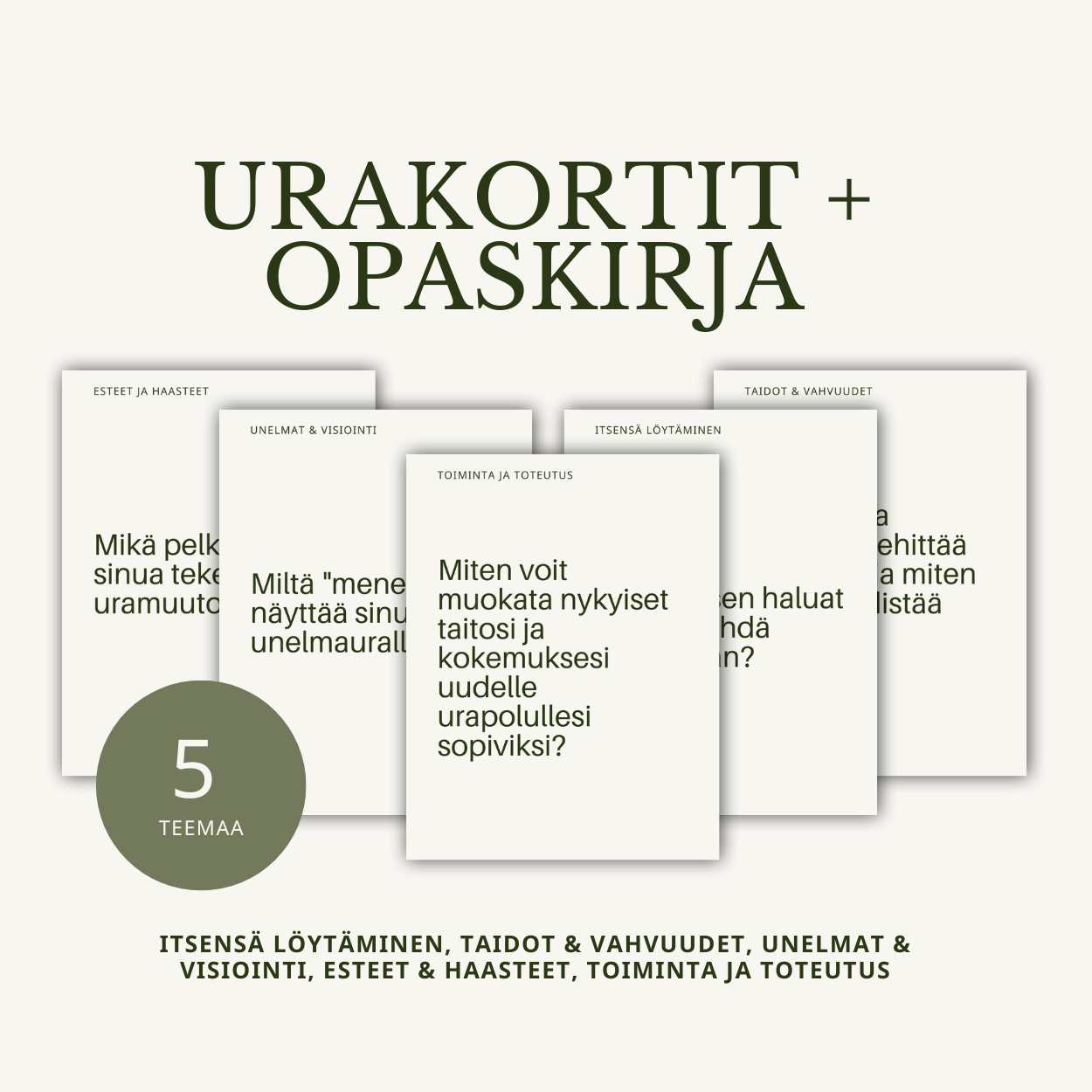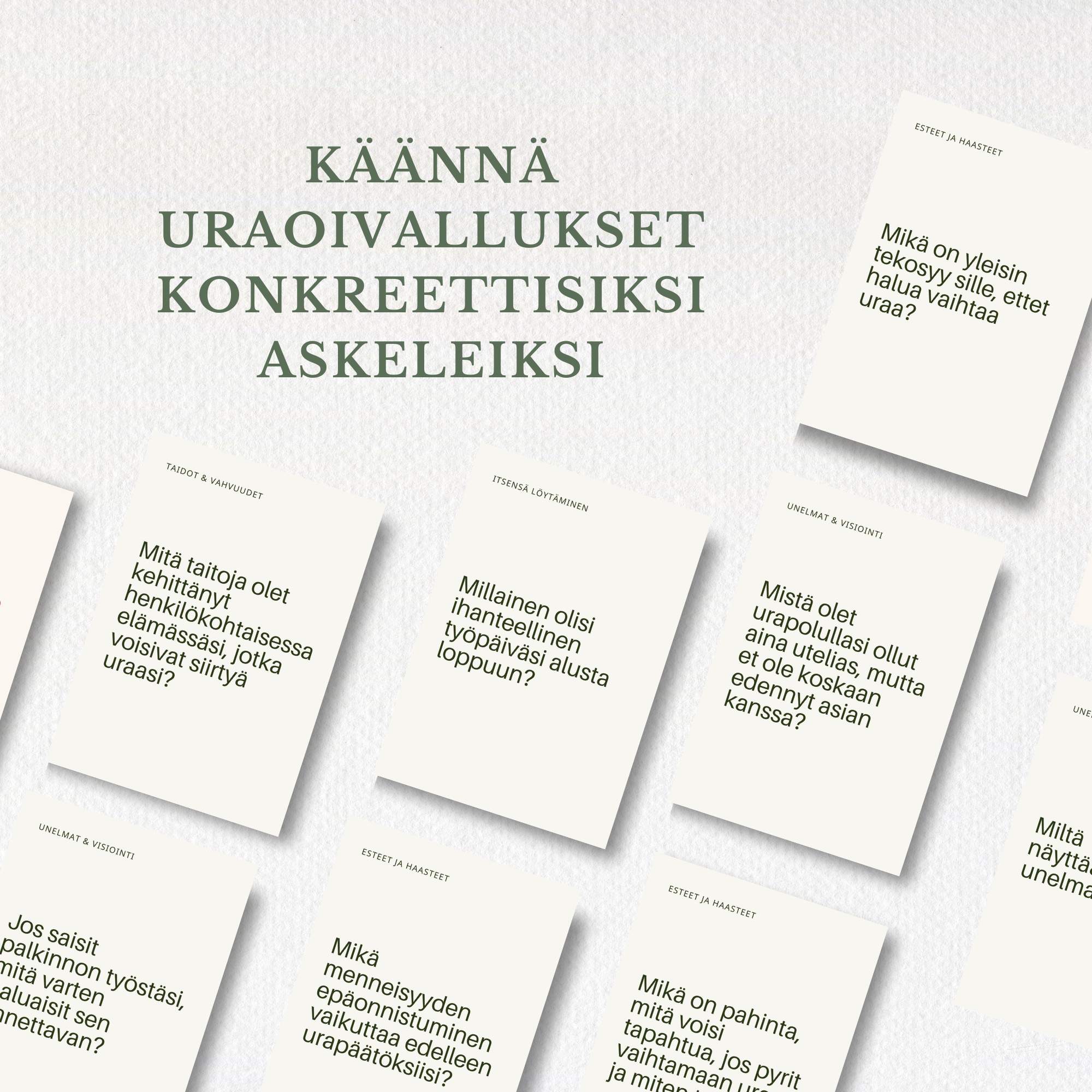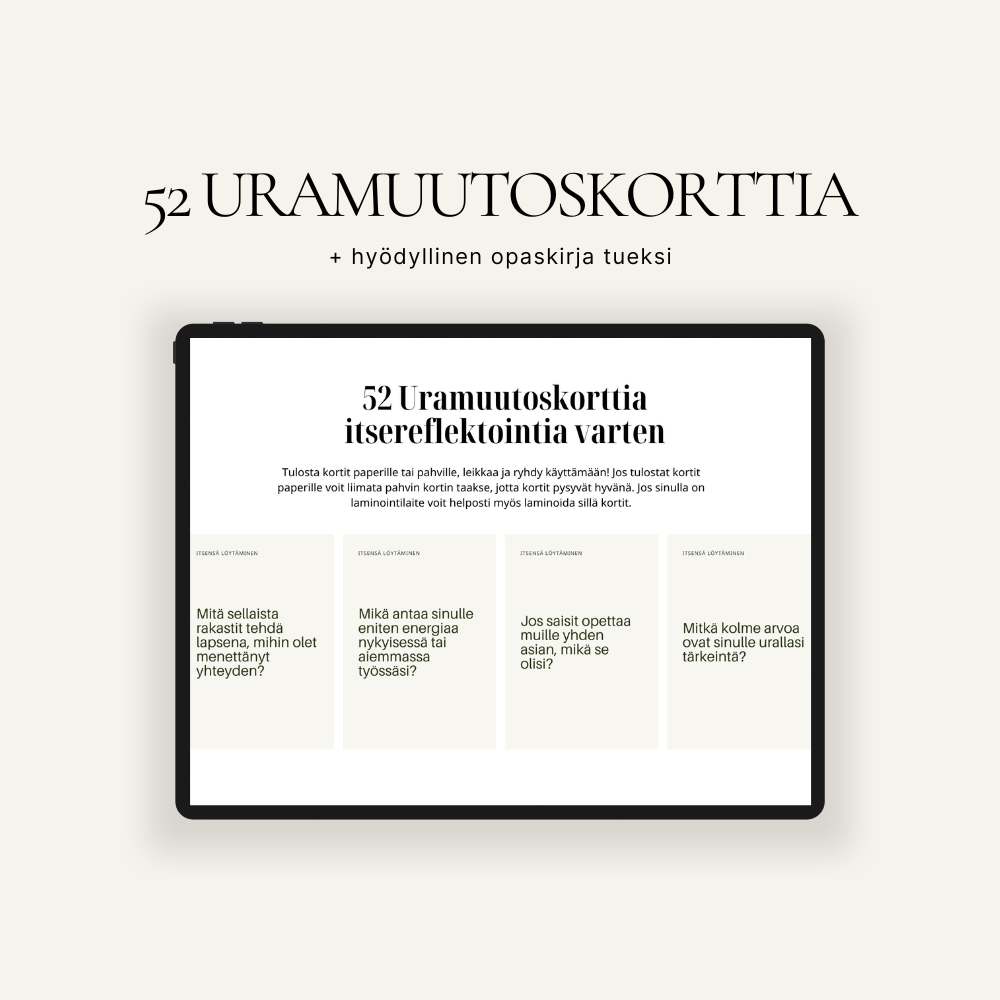 Tämä työkalu auttaa sinua pysähtymään, tutkimaan vaihtoehtoja ja löytämään selkeyttä urapolullesi. Yksi kortti ja pieni hetki kerrallaan.