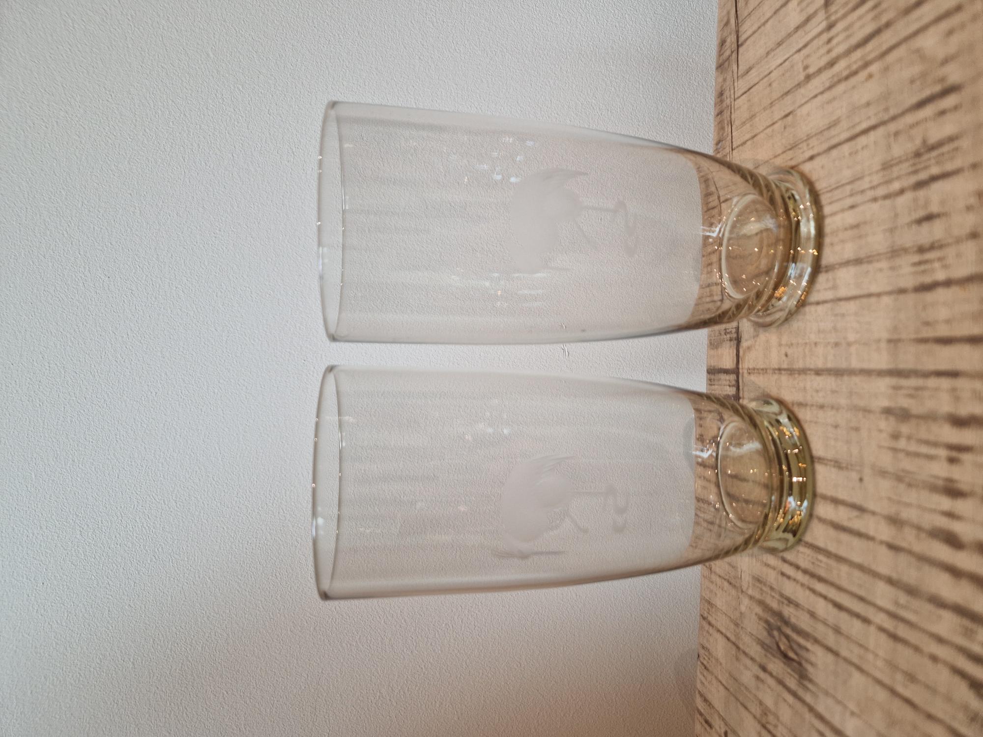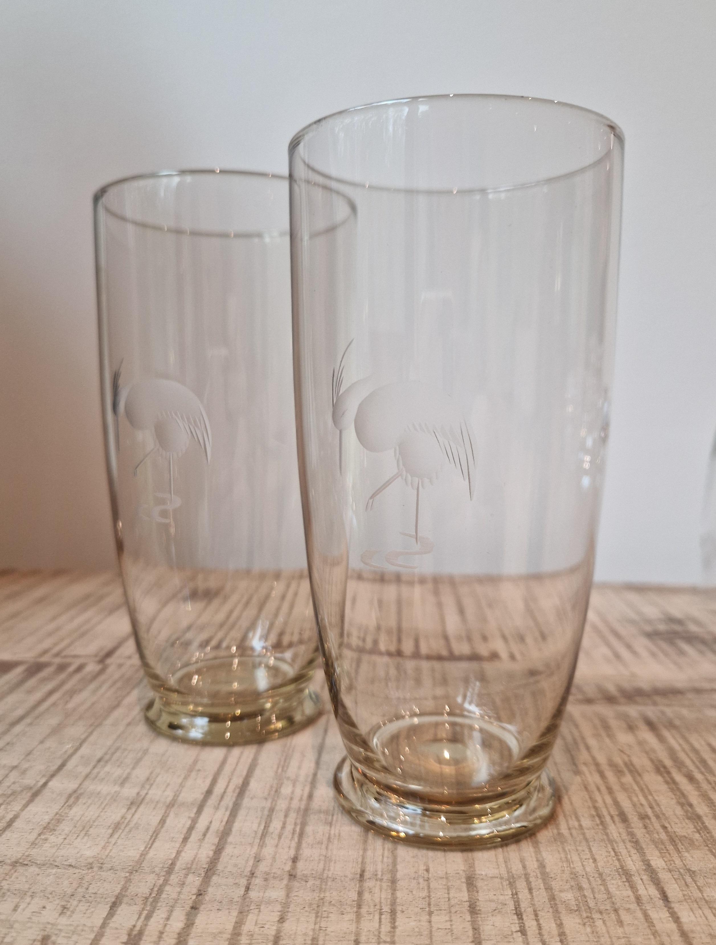 Vanhat juomalasit kauniilla lintuaiheisella koristehionnalla. Korkeus 15cm. Keltaista vanhaa lasia. Yhteishinta kahdelle lasille 25e.