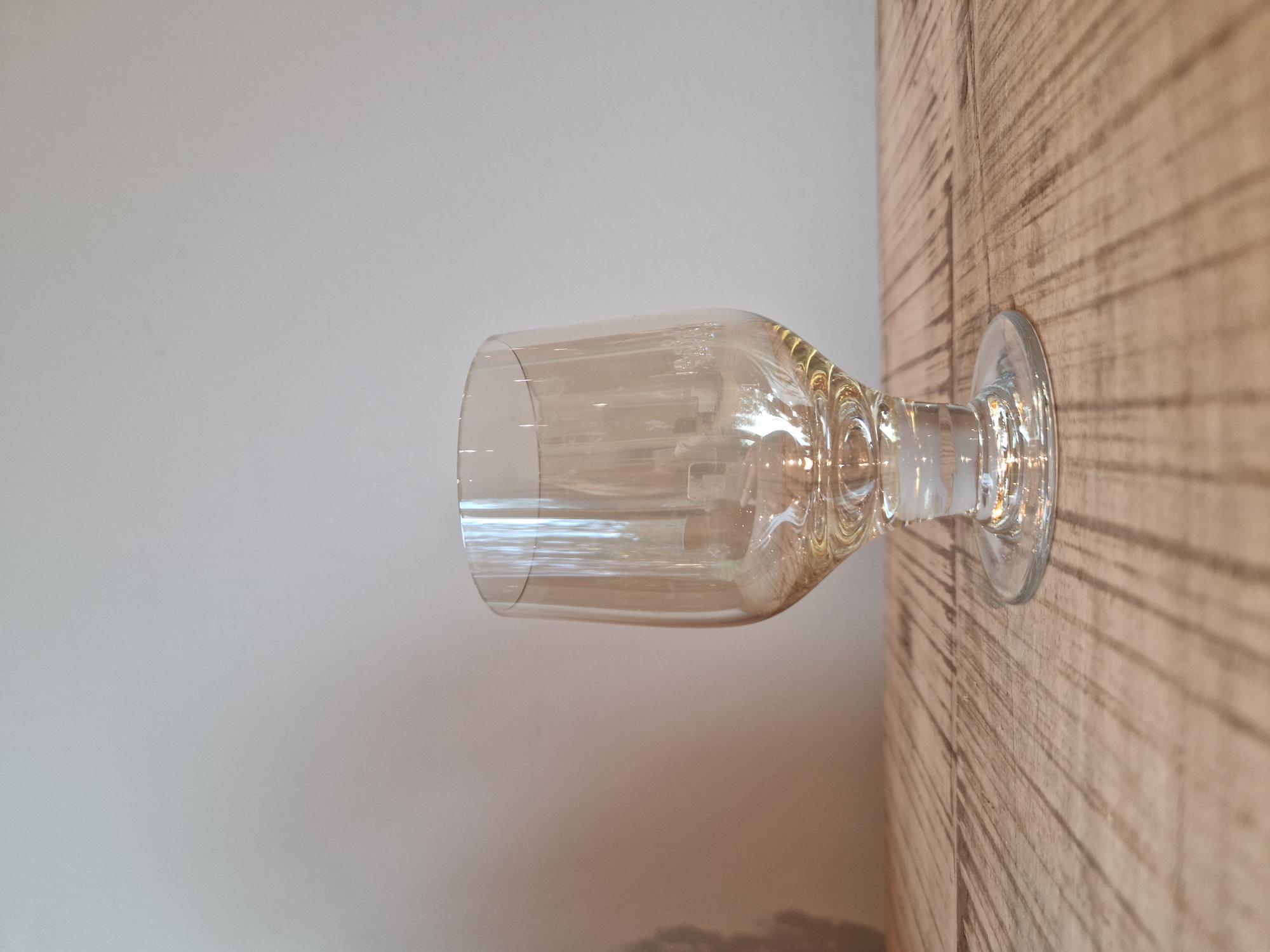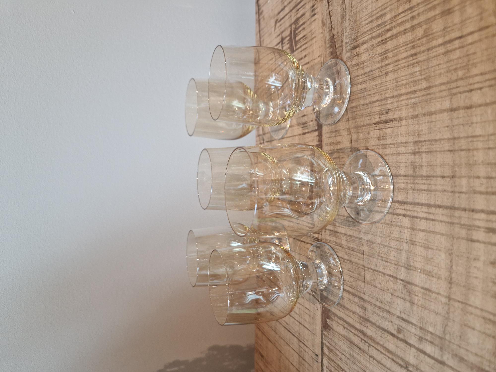 Vanhat juomalasit matalalla jalalla, korkeus 10cm. Lasien yläosa keltaista lasia ja jalkaosa kirkas. Yhteishinta kuudelle lasille 39e.