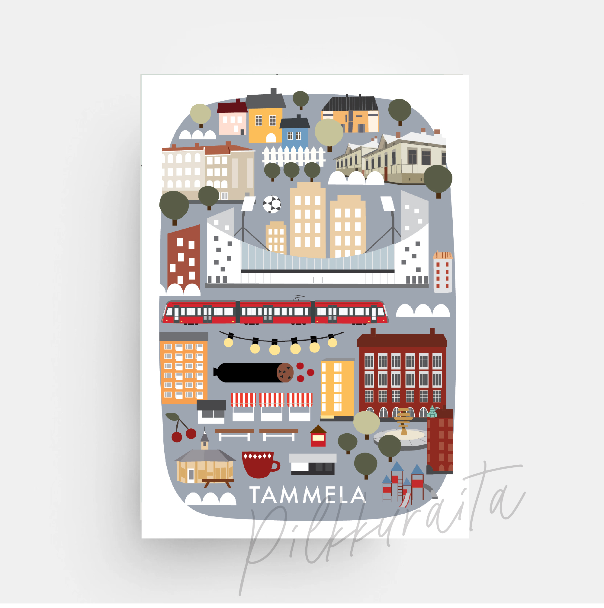Tampereen Tammela vihdoin korttina! Siitä löytyy niin uusi Tammelan stadion kuin perinteinen Tammelantori. Kortin koko on A6 ja kortti on painettu lähituotantona Tampereella. Takapuolella perinteiset osoiterivit. Ei sisällä kirjekuorta.