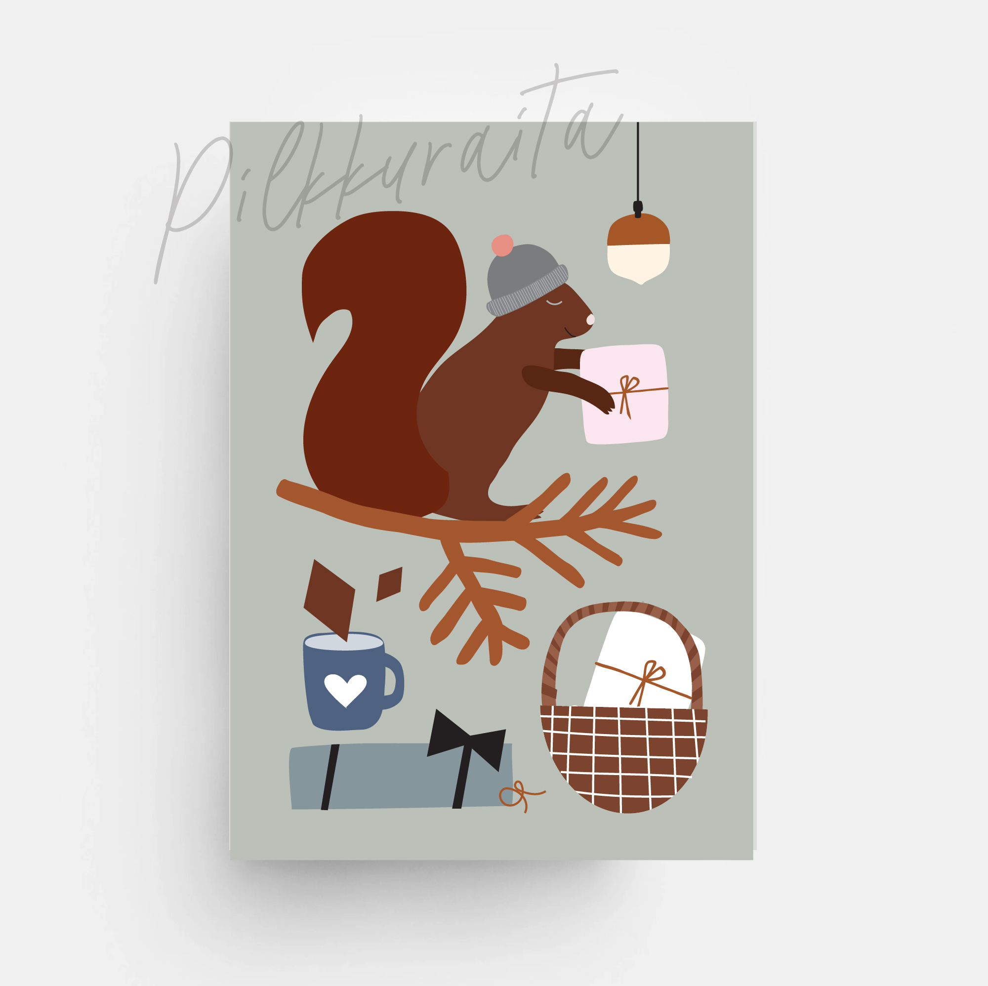 Orava oksalla ja jouluista tunnelmaa A6 -kokoisessa kortissa. Painettu lähituotantona Tampereella. Takapuolella perinteiset osoiterivit. Ei sisällä kirjekuorta.