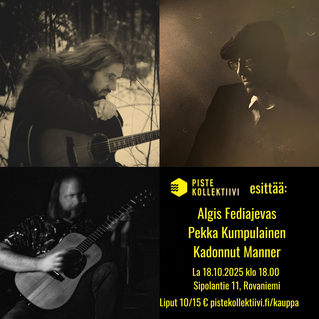 Lauantaina 18.10. Piste Kollektiivin Sipola11-taidetilaan saapuu liettualainen kitaristi-laulaja Algis Fediajevas esittämään tunnelmallisen psykedeelisiä folk-laulelmiaan osana kahdeksan keikan mittaista Suomen-kiertuettaan. Illan avaavat Pisteen muusikkojäsenet Pekka Kumpulainen ja Lauri "Kadonnut" Manner, kumpikin omia omaleimaisia kappaleitaan soolona esittäen.