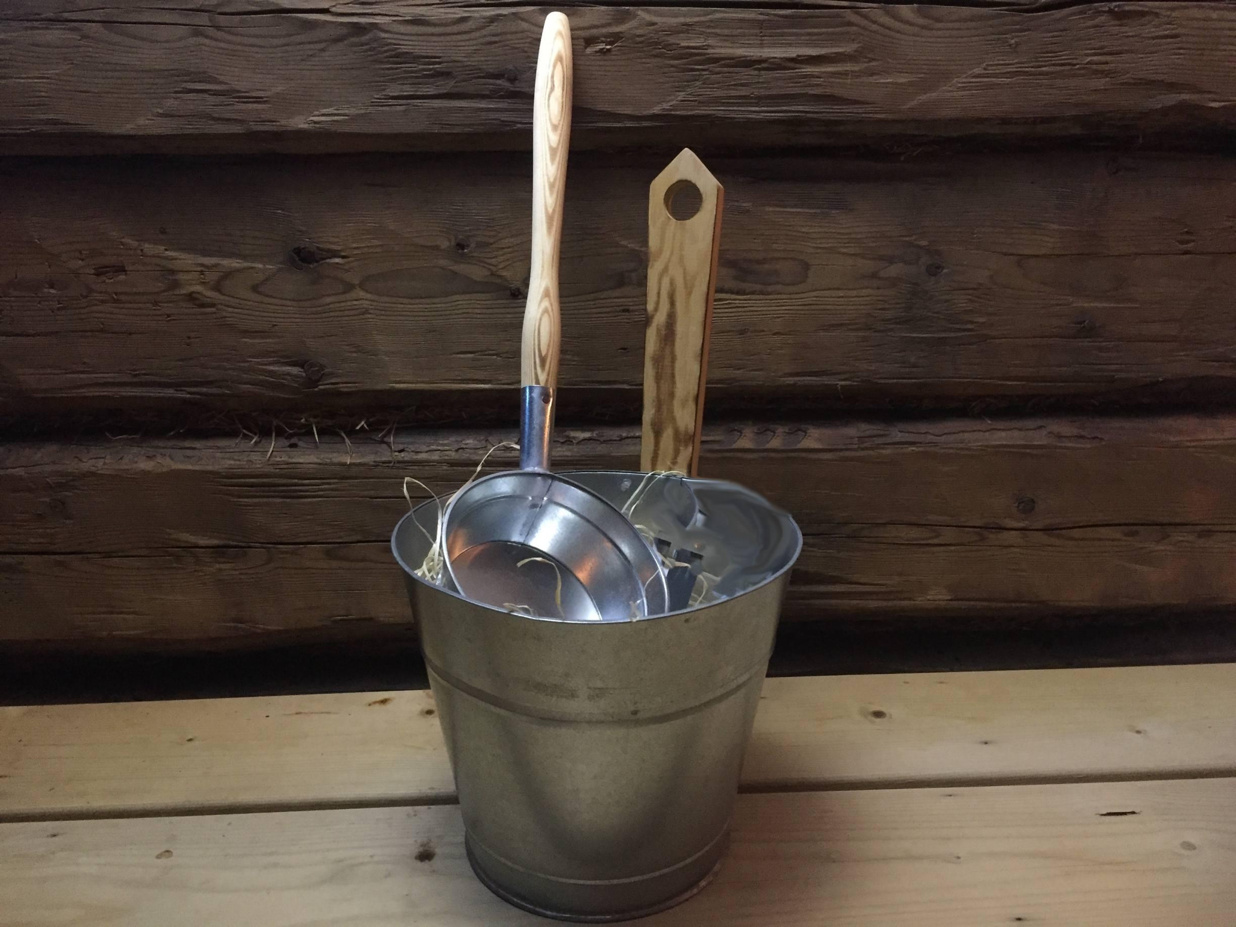 Kiulun tilavuus 5 litraa Löylykauhan tilavuus sopiva Materiaali: galvanoitupelti/puu