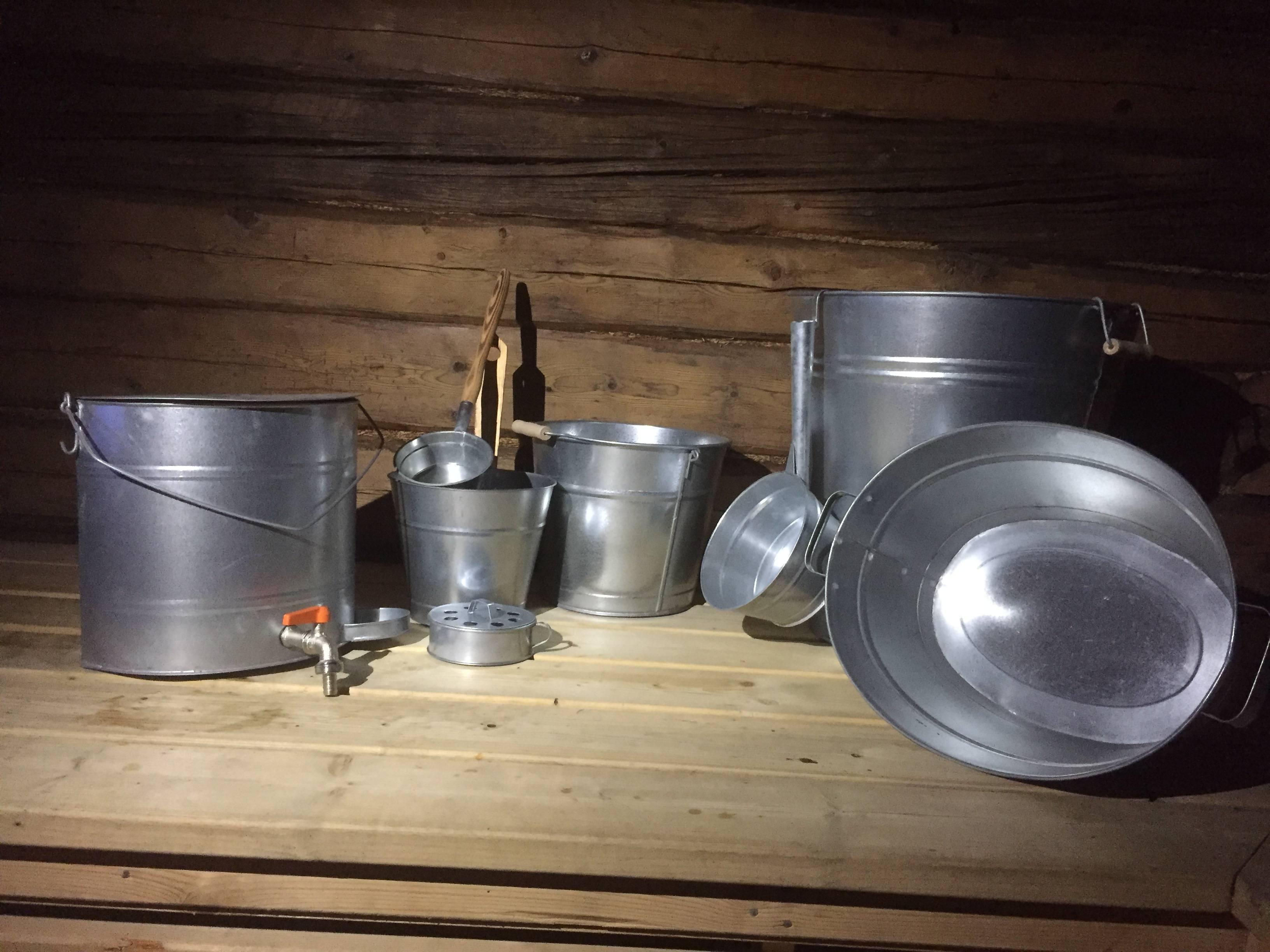 Tuotetiedot - 50 litran vesisaavi - 1 litran vesikauha - 10 litran pesuvanna - 10 litran sanko - 7 litran saunakiulu - sopiva löylykauha - 10 litran hanallinen vesisäiliö - ja vilvoitteluhetkiin hyttyssavurasia Materiaali: galvanoitu pelti