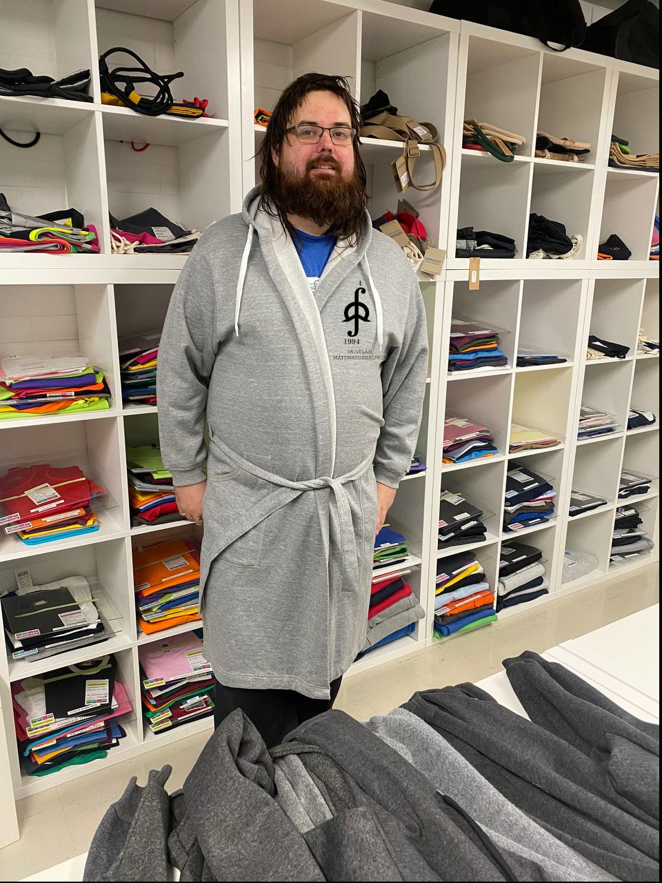 Kylpytakkiin tulee valkoisella logo ja teksti. Kuva on sinne päin, lopullinen tulos voi poiketa. Koska kylpytakit painetaan logollamme, niissä ei ole palautusoikeutta.