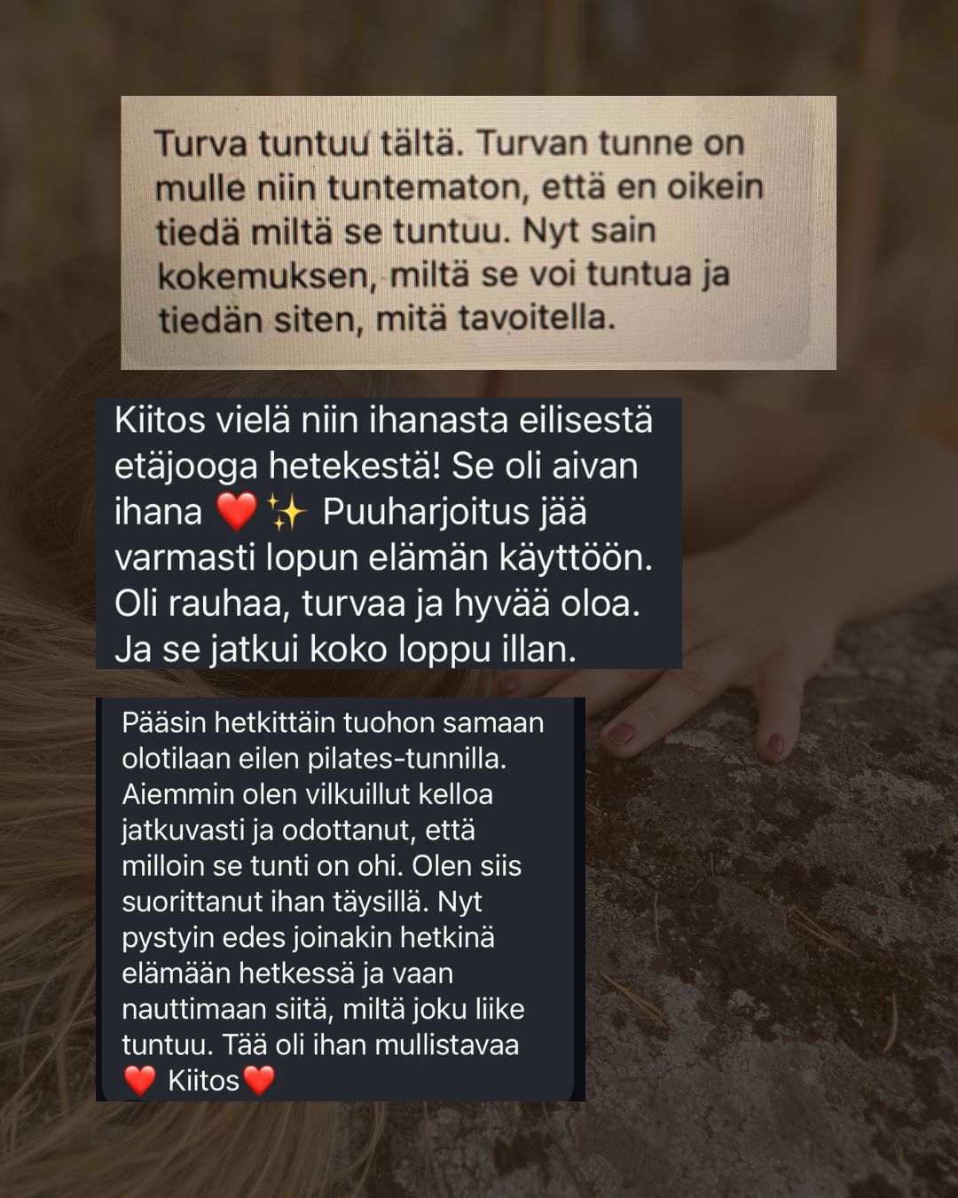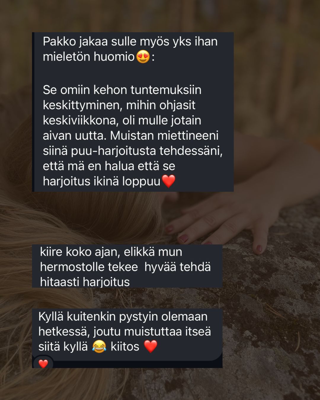 - keho saa hidastaa sillee, miten on sulle sopivasti, ilman pakkoa (ohjaus on traumasensitiivistä ja vakauttavaa)