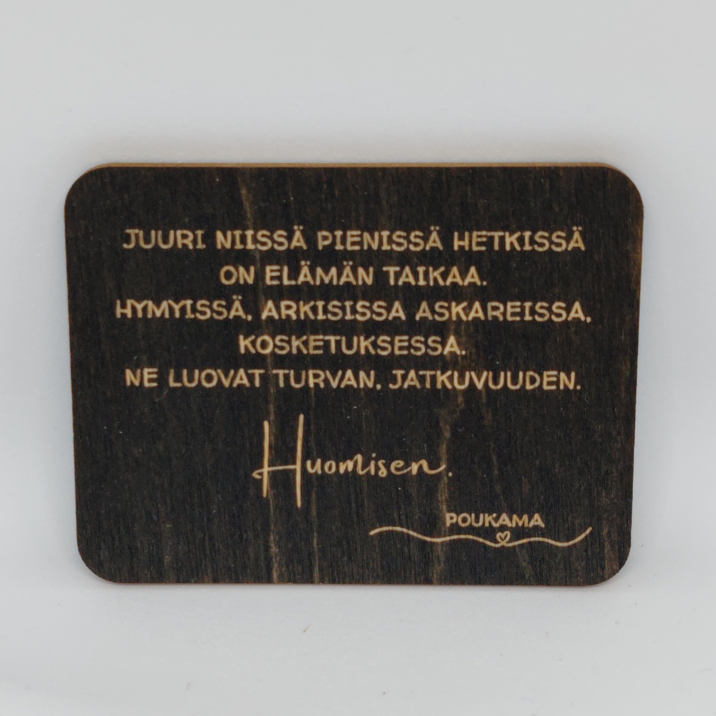 Koivuvanerinen runomagneetti kiinnitettäväksi esimerkiksi jääkaapin oveen. Tuotteella ilahdutat niin itseäsi kuin ystävääsi. Väri musta. Koko 4,6 cm x 6 cm. Valmistettu Suomessa. MUISTA VALITA TOIMITUSTAPA OMASTA TUOTEKATEGORIASTA!