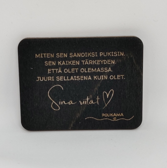 Koivuvanerinen runomagneetti kiinnitettäväksi esimerkiksi jääkaapin oveen. Tuotteella ilahdutat niin itseäsi kuin ystävääsi. Väri musta. Koko 4,6 cm x 6 cm. Valmistettu Suomessa. MUISTA VALITA TOIMITUSTAPA OMASTA TUOTEKATEGORIASTA!