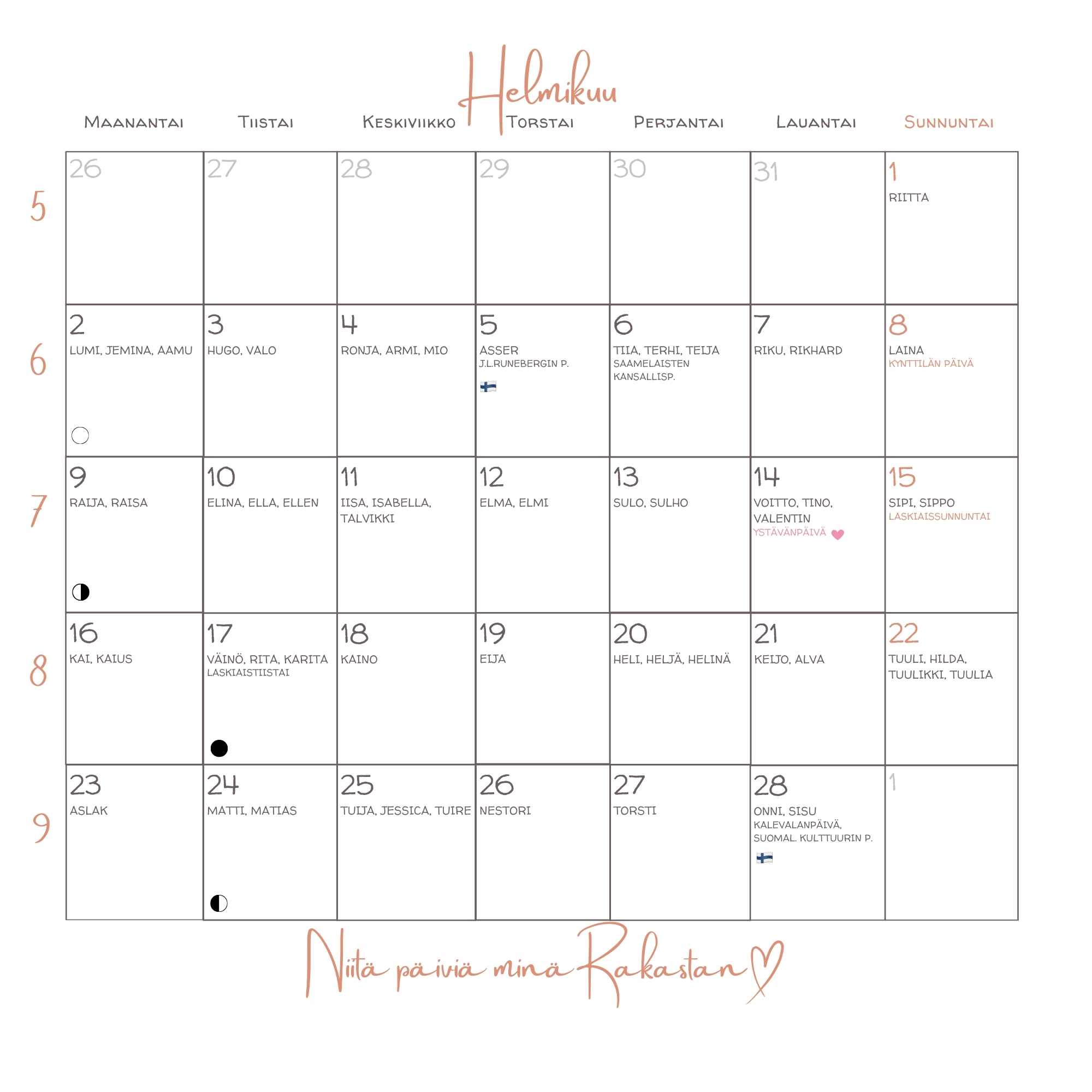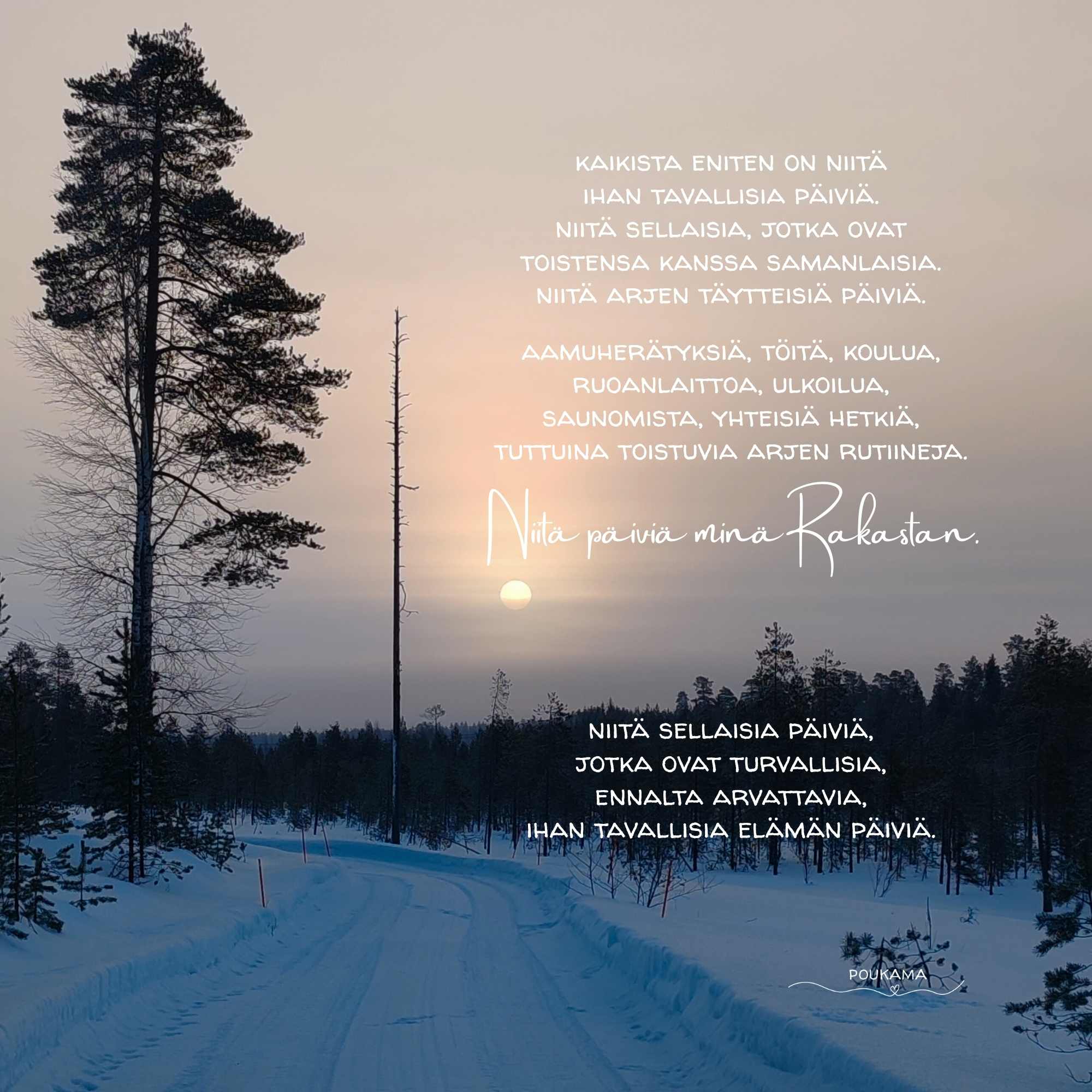 Poukaman vuoden 2026 seinäkalenterissa on kannessa ja jokaiselle kuukaudelle oma runo luontokuvassa, yhteensä 13 runokuvaa. Kalenterin koko on 200 x 200 mm, avattuna 200 x 400 mm. Vihkosidottu, ripustusreikä, sivuja yhteensä 28. Kalenterissa on Helsingin yliopiston viralliset nimi-, juhla- ja liputuspäivät sekä kuun vaiheet. Valmistettu Suomessa, suunnitellut Johanna Korhonen.