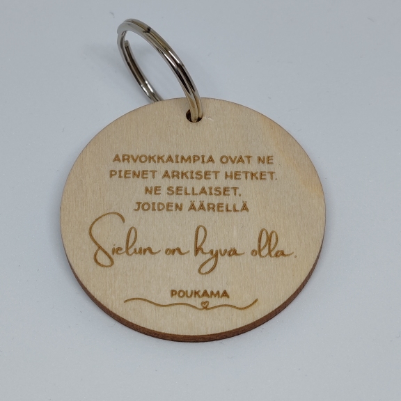 Koivuvanerinen avaimenperä. Tuotteella ilahdutat niin itseäsi kuin ystävääsi. Väri koivu. Halkaisija 5 cm. Valmistettu Suomessa.