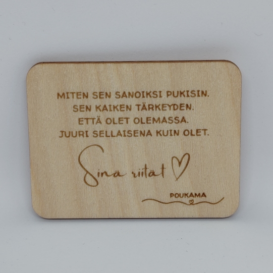 Koivuvanerinen runomagneetti kiinnitettäväksi esimerkiksi jääkaapin oveen. Tuotteella ilahdutat niin itseäsi kuin ystävääsi. Väri koivu. Koko 4,6 cm x 6,1 cm. Valmistettu Suomessa. MUISTA VALITA TOIMITUSTAPA OMASTA TUOTEKATEGORIASTA!