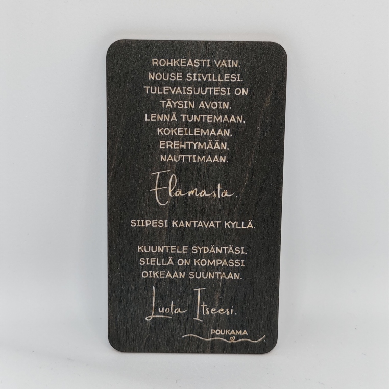 Koivuvanerinen runomagneetti kiinnitettäväksi esimerkiksi jääkaapin oveen. Tuotteella ilahdutat niin itseäsi kuin ystävääsi. Väri musta. Koko 9 cm x 5 cm. Valmistettu Suomessa. MUISTA VALITA TOIMITUSTAPA OMASTA TUOTEKATEGORIASTA!