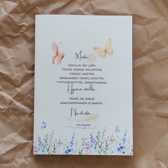 A5 kokoinen vihko, jossa 48 blancoa sivua. Sisäsivuilla tekstit "sinulla on lupa", "nauttia elämästä". Paperit: Sisus : 90g Edixion Offset. Kannet : 170g Edixion Offset. Kannen väri heleän keltainen. Paino 90g. Valmistettu Suomessa. Suunnittelija Johanna Korhonen.