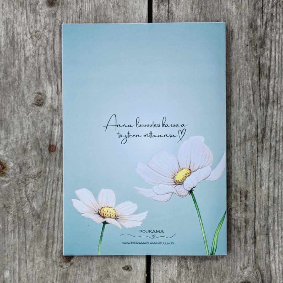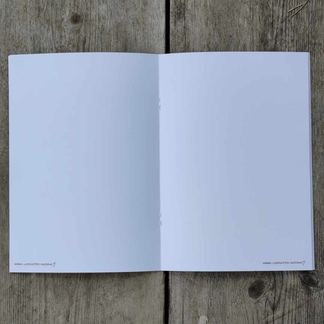A5 kokoinen vihko, jossa 48 blancoa sivua. Paperit: Sisus : 90g Edixion Offset. Kannet : 170g Edixion Offset. Kannen väri vihreä. Paino 93g. Koko 22cmx15,5cm. Valmistettu Suomessa. Suunnittelija Johanna Korhonen.