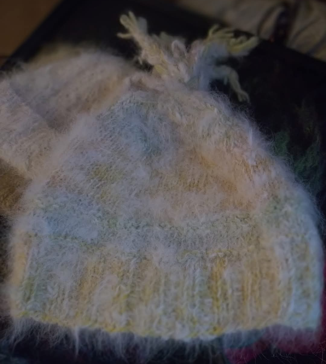 Pipo joka on valmistettu Pyreneittenkoiran karvalangasta, sekä kasvivärjätystä villalangasta.