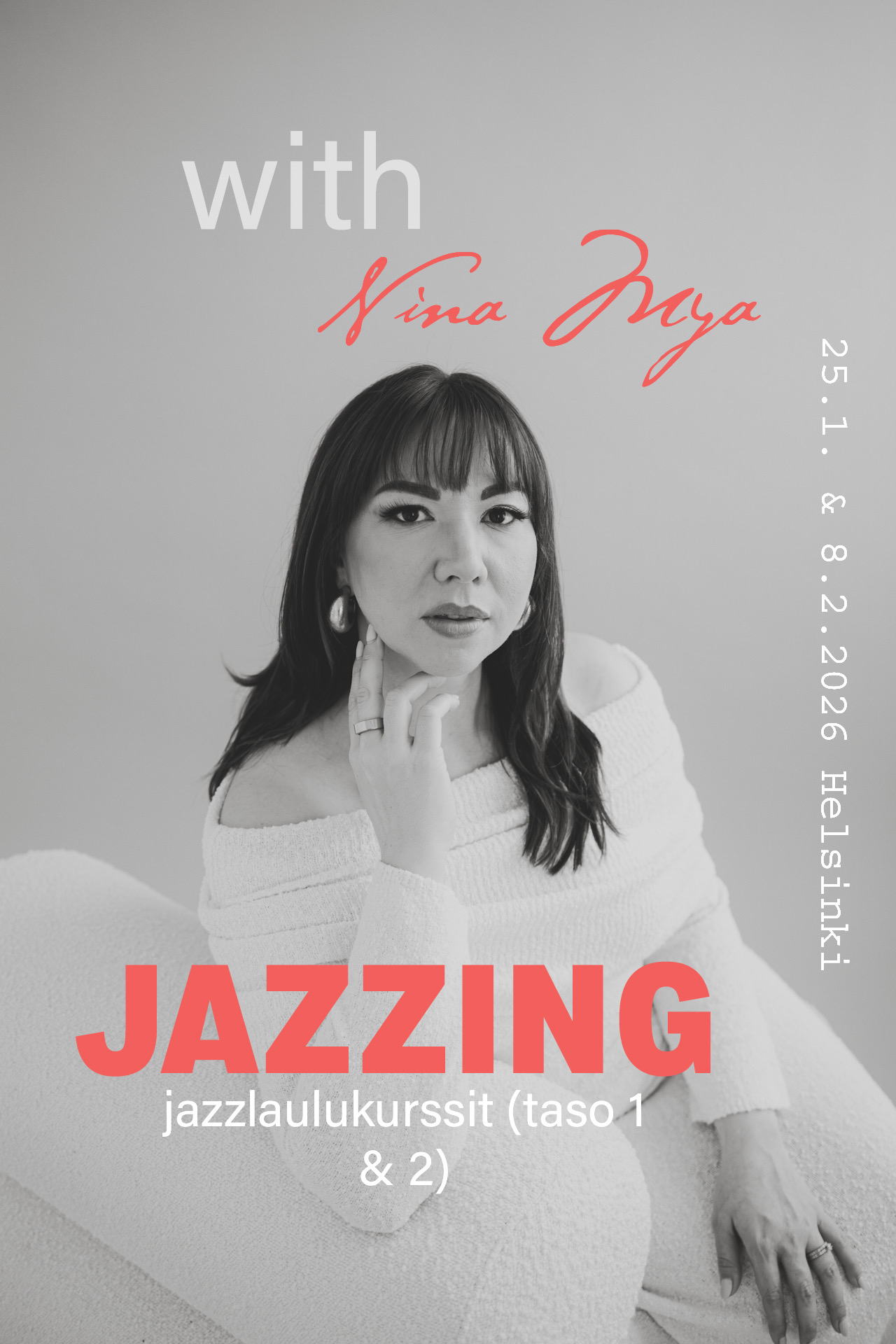 JAZZING -jazzlaulukurssit 25.1.2026 & 8.2.2026 taso 1 & 2 yhdessä, hinta alennettu kun ostat molemmat kurssit yhdessä! Taso 1 jazzlaulun peruskurssit (rytmiikka & improvisaatio), taso 2 jazzlaulusoundin ja tulkinnan kurssi. Kts. tarkemmat kuvaukset verkkokaupasta.