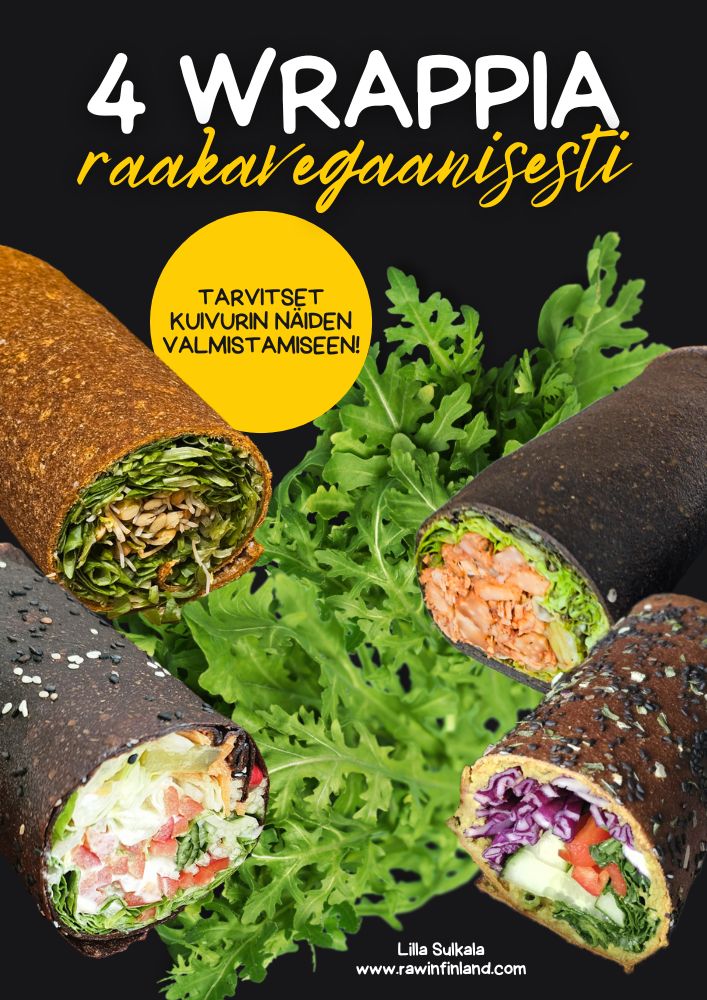 4 parasta raakavegaanista wrappireseptiäni koottuna yhteen minikirjaan. Tarvitset näiden wrappien tekemiseen tehosekoittimen, kuivurin suurilla levyillä sekä silikoniset reunalliset alustat ja kakkuveitsen tasoitukseen. Sukella herkullisten ja ravitsevien gourmet-raakaruokien maailmaan tämän täydellisen wrappivalikoiman kera!