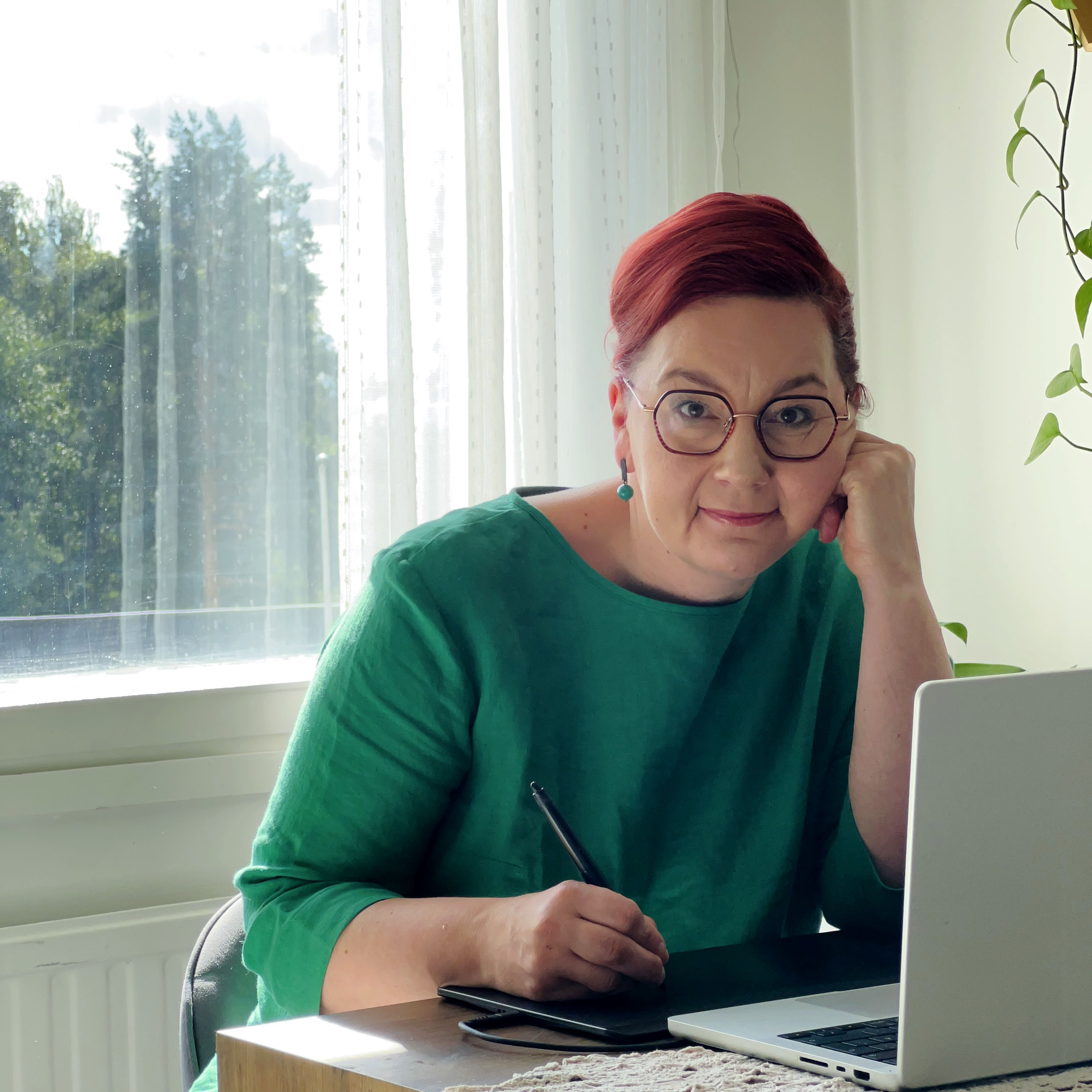 Kurssinohjaajana toimin minä, Anu-Riikka. Minulla repussa pedagoginen koulutus (lto, eo), taideopintoja sekä takana lähes kaksikymmentä vuotta mixedmediaa, askartelua ja kuvataidetta. Viimeiset viisi vuotta olen tehnyt kuvituksia, graafistasuunnittelua ja kuvisopetusta yrittäjänä, joten olet osaavissa käsissä.