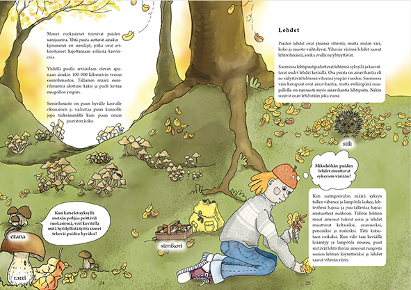 äkevätkö ja kuulevatko puut? Ota selvää, mikä merkitys puilla on ihmisten, eläinten ja koko maapallon hyvinvoinnille. Metsän lumo kertoo monipuolisesti puista, mutta myös muista kasveista ja eläimistä sekä siitä mitä luonnossa eri vuodenaikoina tapahtuu ja mitä siellä voi tehdä. Kirjan upea kuvitus ilahduttaa kaikenikäisiä lukijoita.