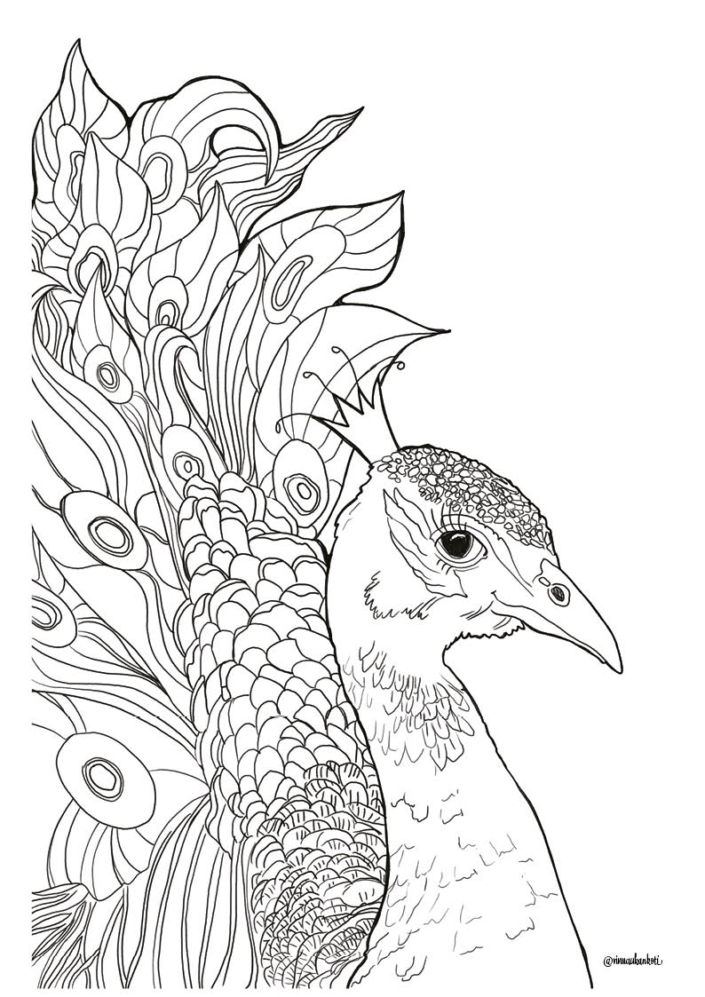 Lataa kuitista riikinkukko-aiheinen värityskuva vapaasti käytettäväksi värityskuvana.