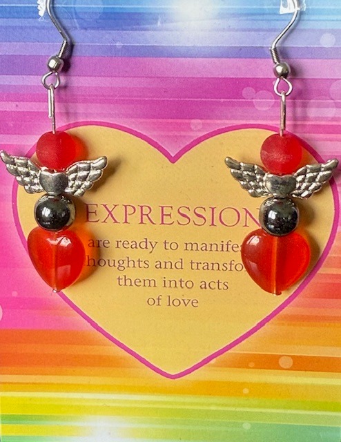 Lasihelmistä valmistetut enkelikorvakorut. Mukaan tulee Voimakortti "The Power on Love" -korttipakasta. Osassa voimakivi mukana, tässä hematiitti. Koukut hopeoitu. Hinta sisältää posti- ja käsittelykulut 3€.