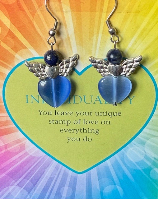 Lasihelmistä valmistetut enkelikorvakorut. Mukaan tulee Voimakortti "The Power on Love" -korttipakasta. Osassa voimakivi mukana, tässä lapis lazuli. Koukut hopeoitu. Hinta sisältää posti- ja käsittelykulut 3€.