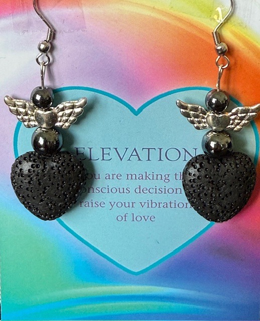 Lasihelmistä valmistetut enkelikorvakorut. Mukaan tulee Voimakortti "The Power on Love" -korttipakasta. Osassa voimakivi mukana, tässä laavakiveä ja hematiittia. Koukut hopeoitu. Hinta sisältää posti- ja käsittelykulut 3€.