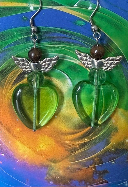 Lasihelmistä valmistetut enkelikorvakorut. Mukaan tulee Voimakortti "The Power on Love" -korttipakasta. Osassa voimakivi mukana, tässä tiikerinsilmä. Koukut hopeoitu. Hinta sisältää posti- ja käsittelykulut 3€.